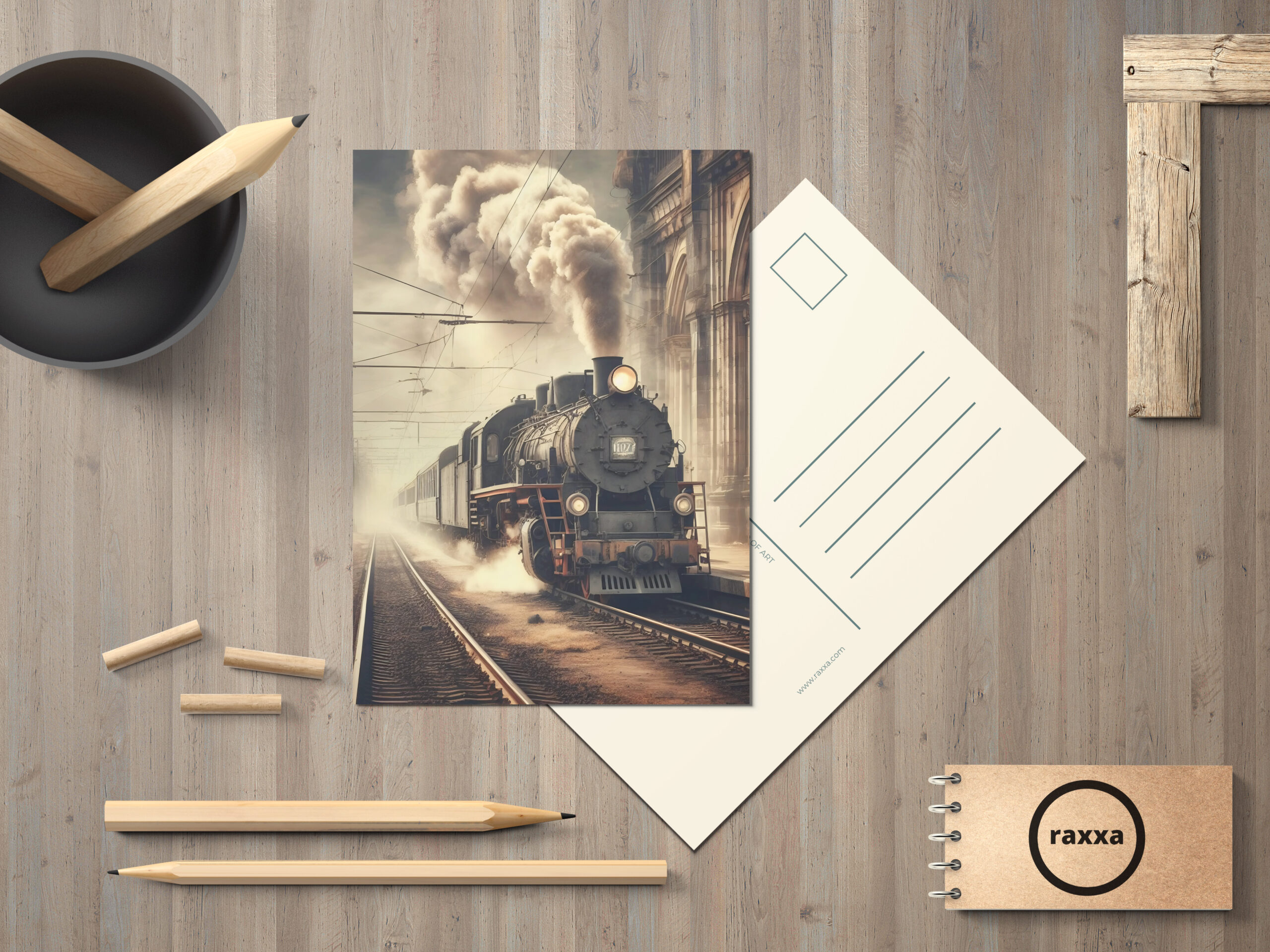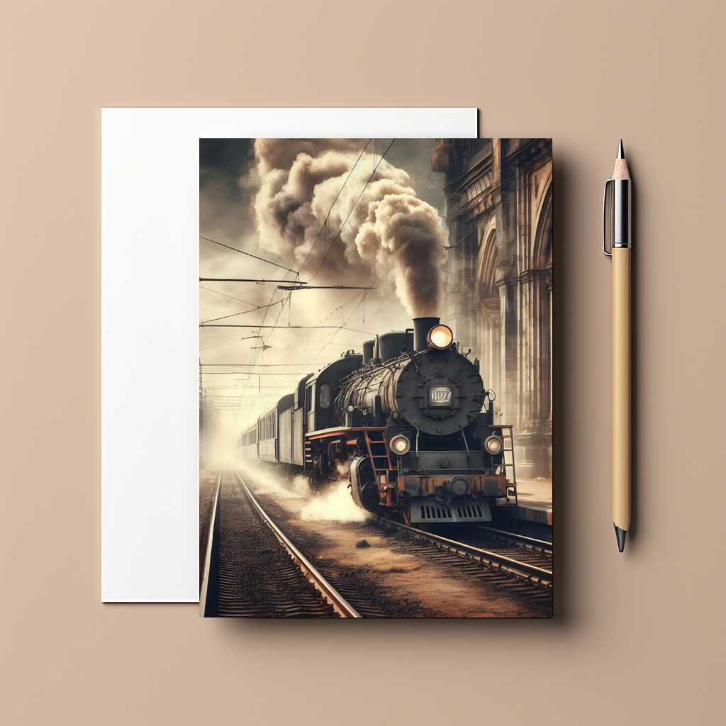 A retro-style picture shows an elegant steam train passing majestically by a building. The locomotive gleams with its polished metal as smoke swirls from its chimney. The tracks run alongside the building and disappear into the distance. The building is classic in style, with architectural details that reflect a bygone era.