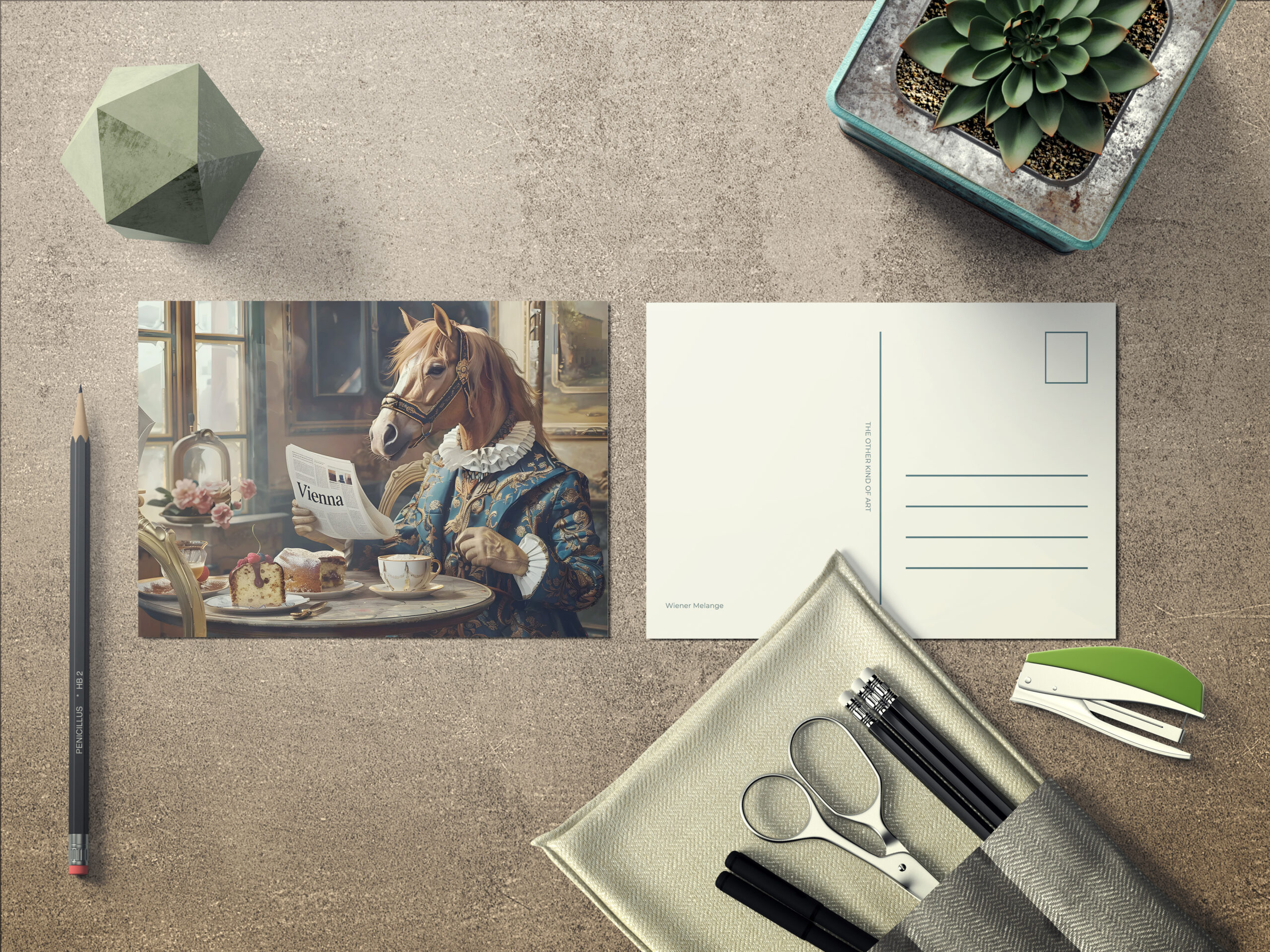 A horse dressed in baroque style reads the Vienna News newspaper at a marble table and enjoys a cake and a Viennese Melange.