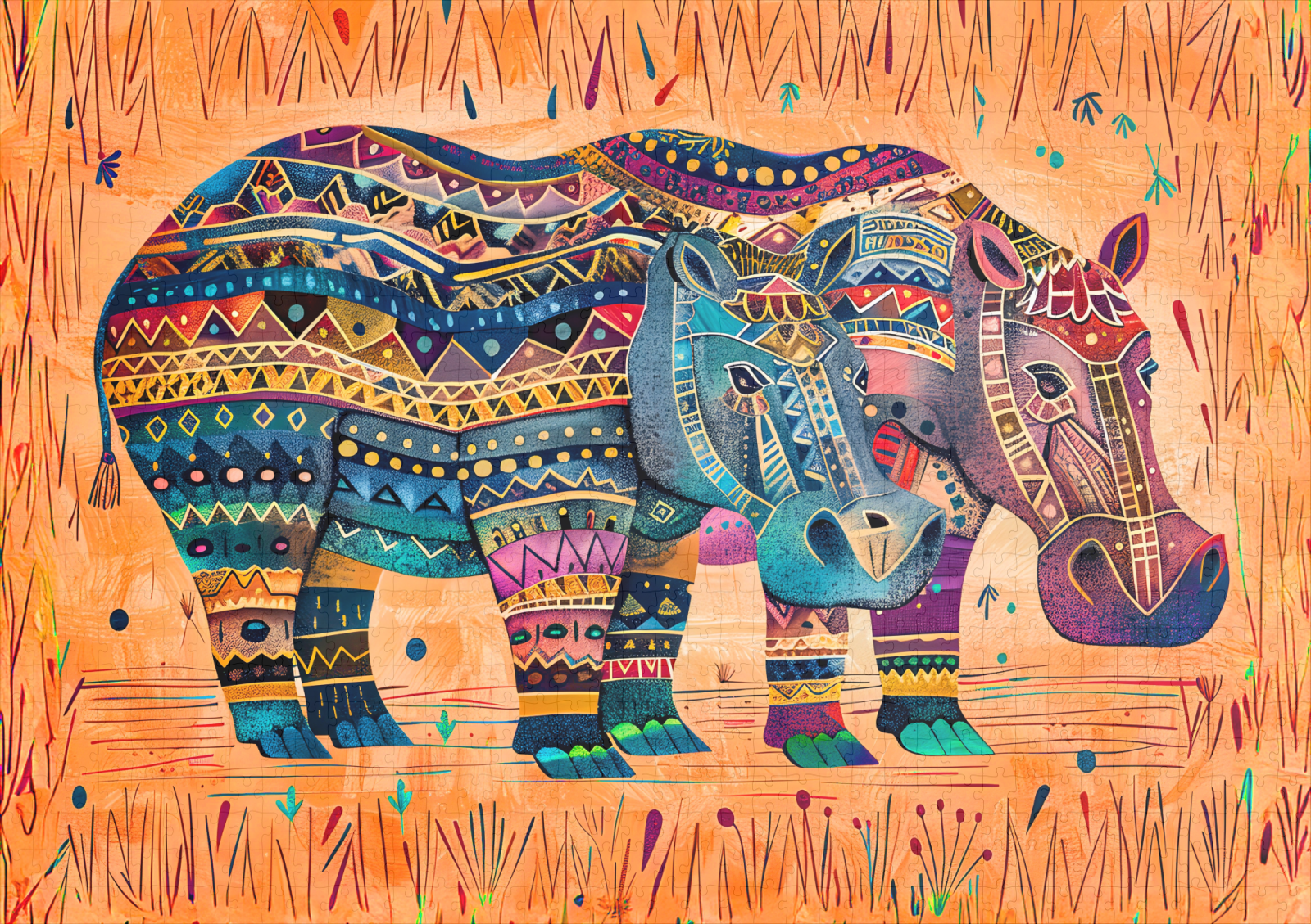 Two stylized African hippos side by side, adorned with colorful tribal patterns in a vivid ethnic folk art style.