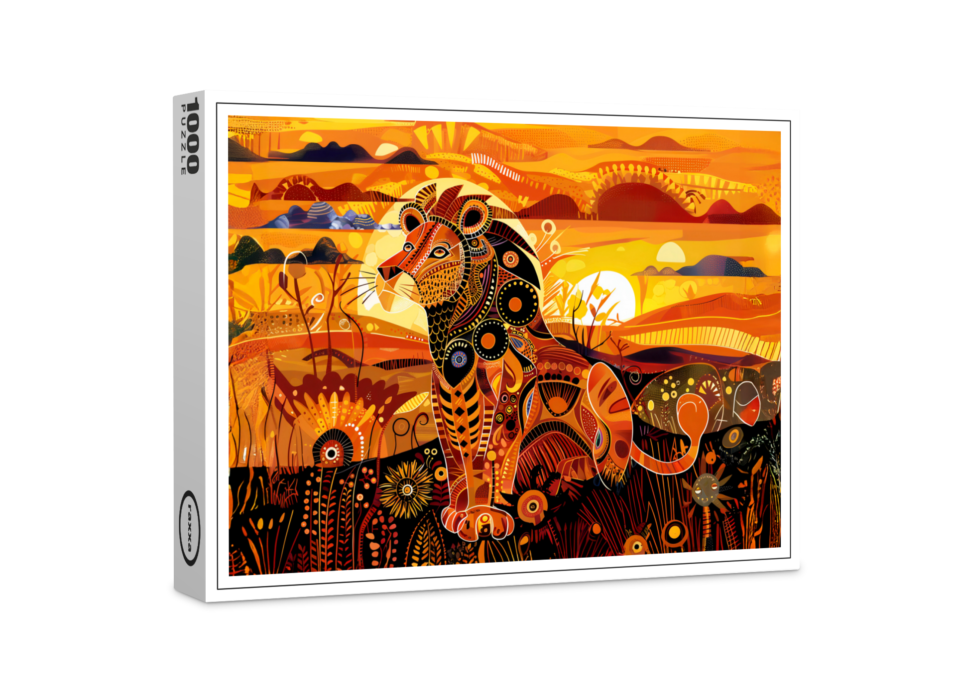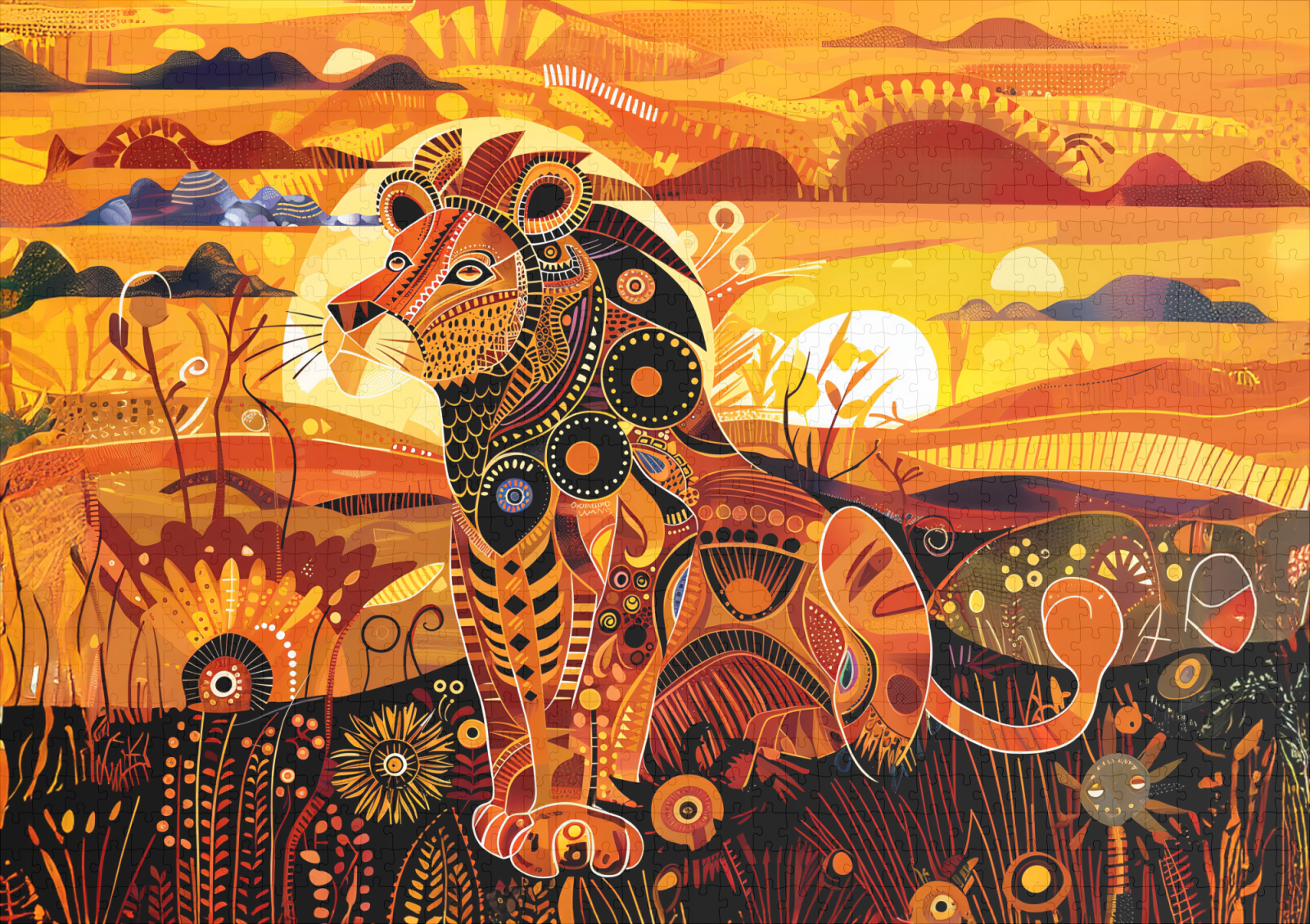 Side view of a stylized African lion in bold colors and detailed tribal pattern style, set in a warm savanna scene.