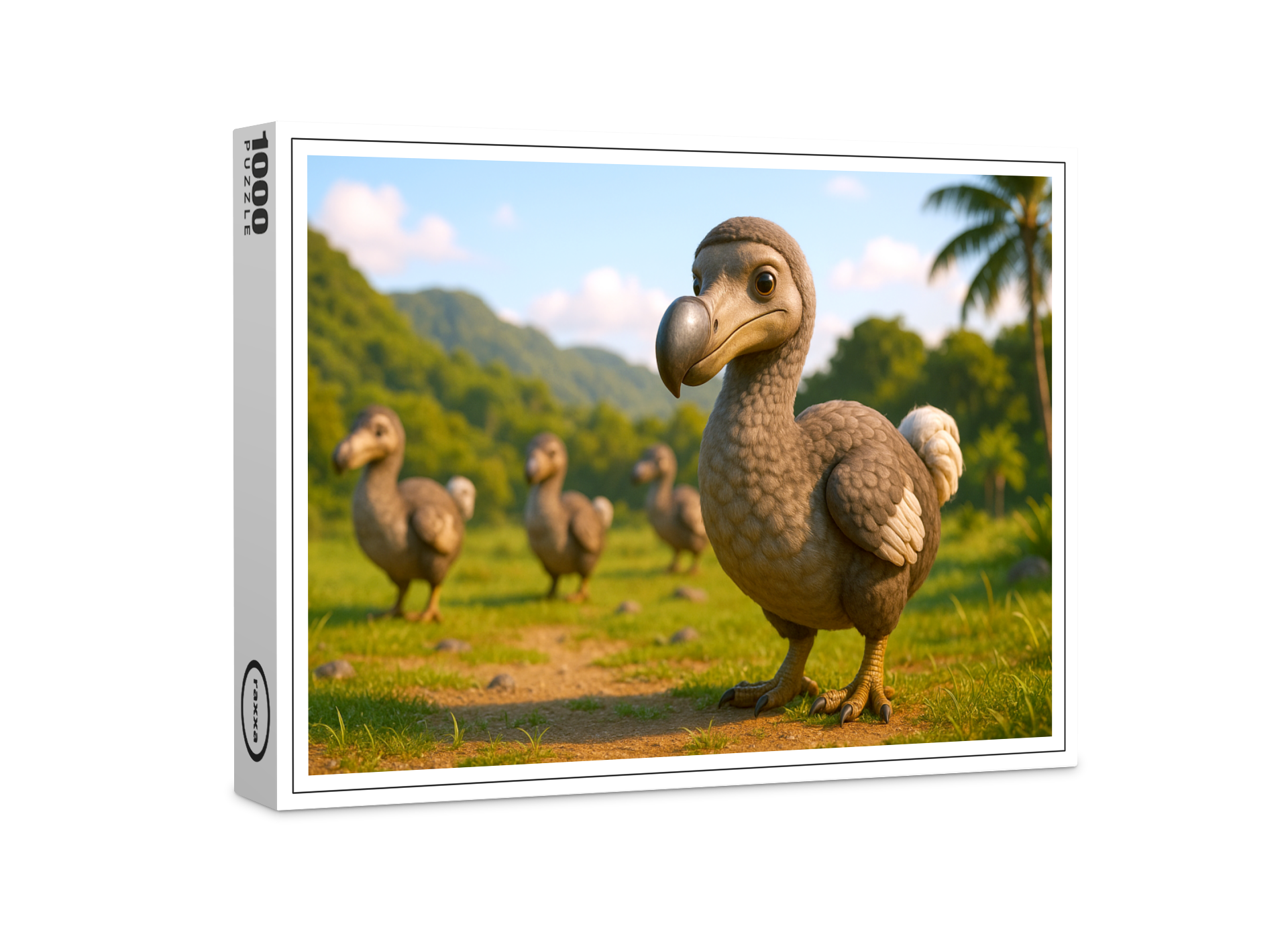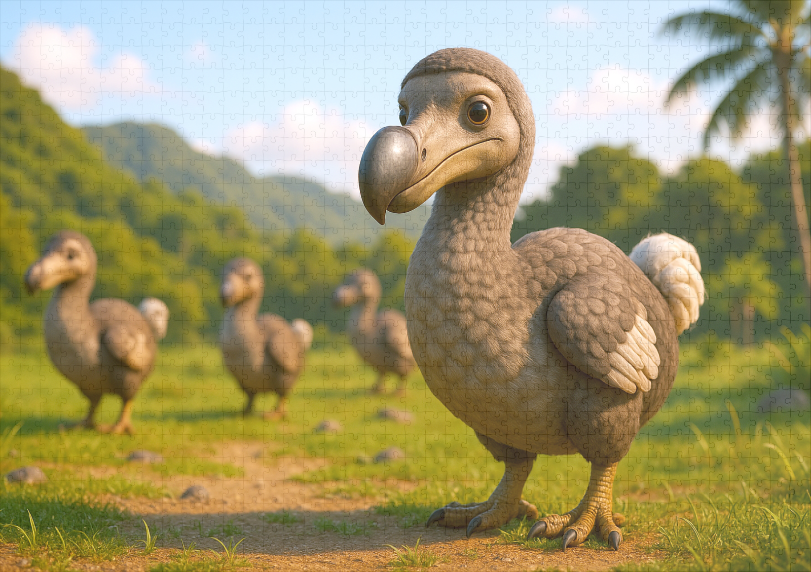Der ausgestorbene flugunfähige Vogel Dodo oder auch Dronte genannt. Ein neugieriger Dodo blickt direkt in die Kamera, umgeben von weiteren Artgenossen auf einer sonnigen Lichtung mit Palmen. Das Motiv ist humorvoll, charmant und im liebevoll stilisierten 3D-Look gehalten.