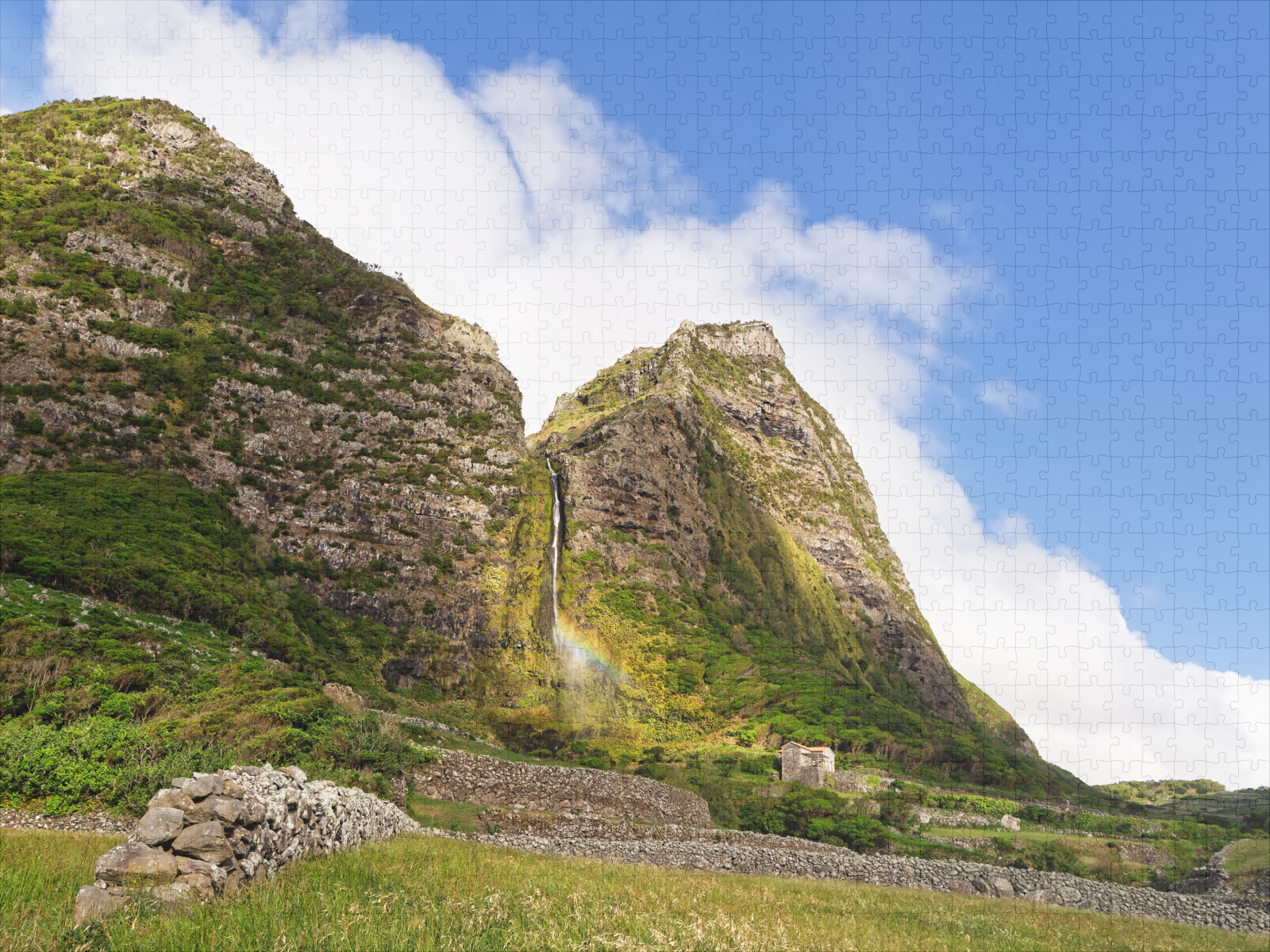 Large waterfall with rainbow on the Azores island of Flores, steep imposing rock face, blue sky with clouds, a landmark of the island - Location: Azores, Flores Island, Faja Grande, Ribeira das Casas