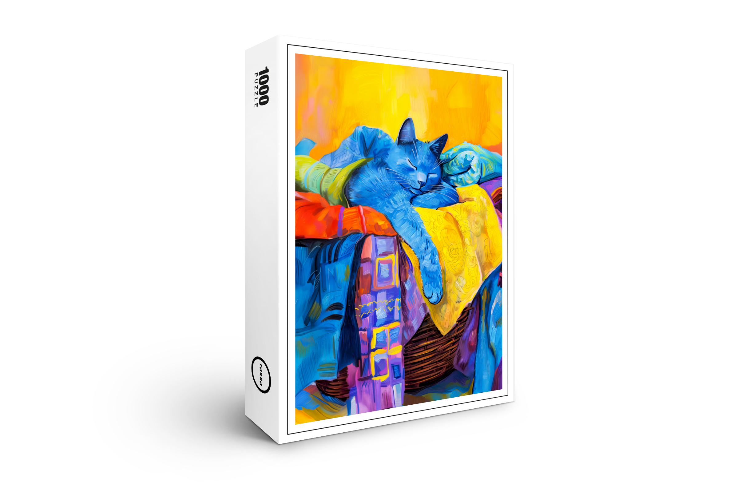 blue-black cat rests on a colorful armchair in a vibrant, cozy painting style.