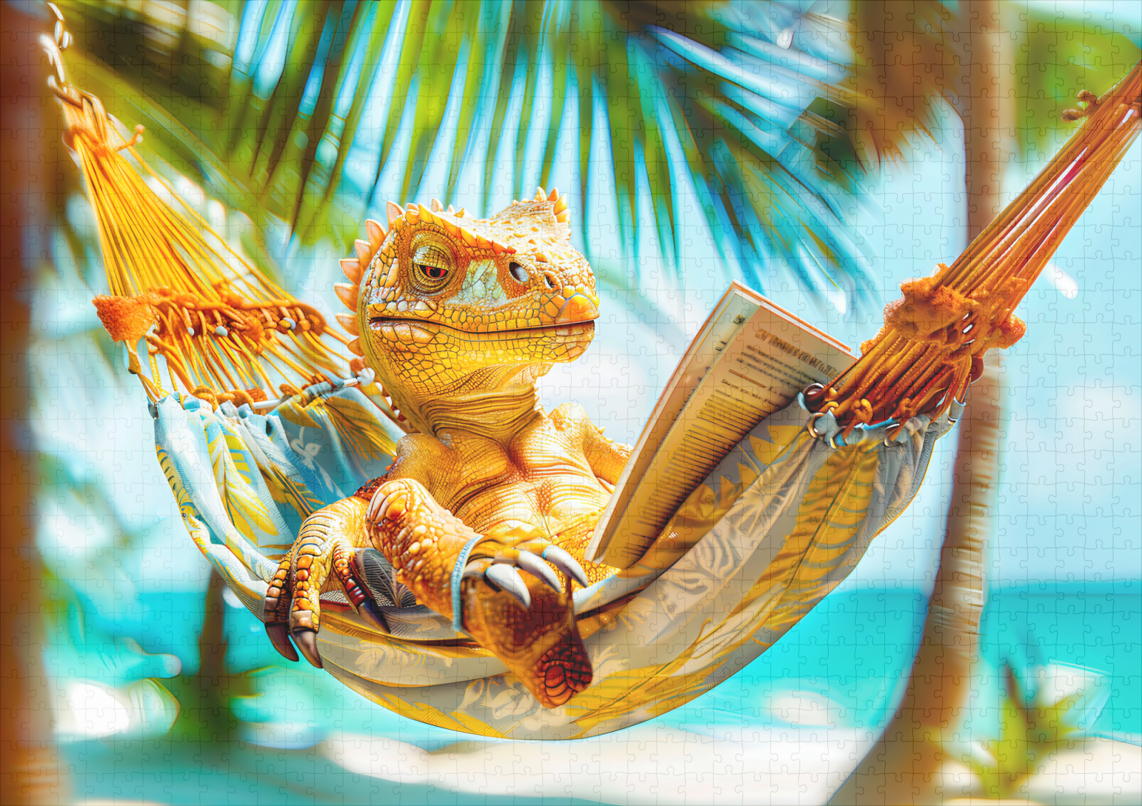 Lazy dinosaur relaxing in a hammock between palm trees. A calm and funny prehistoric beach moment.