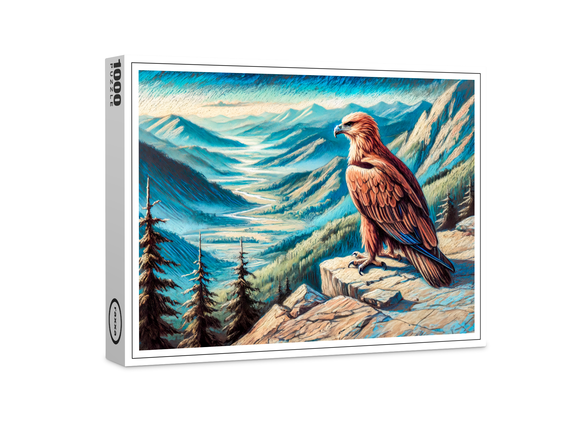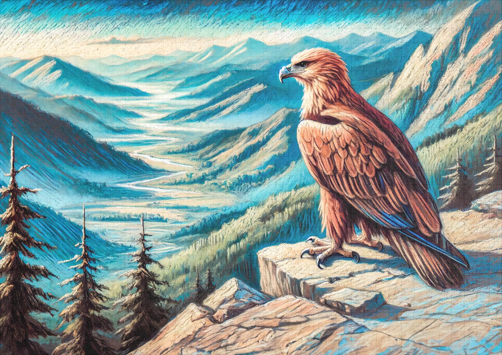 majestic eagle sits on a rock, overlooking a vast mountain landscape. This pastel chalk drawing captures the eagles powerful presence and the beauty of the wilderness, ideal for wildlife and nature art