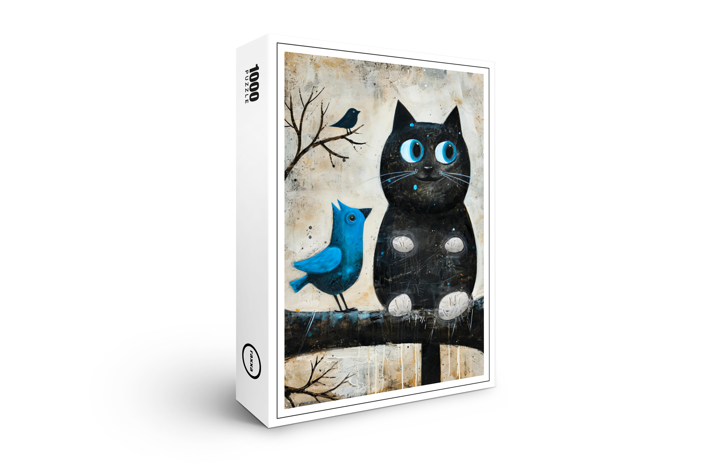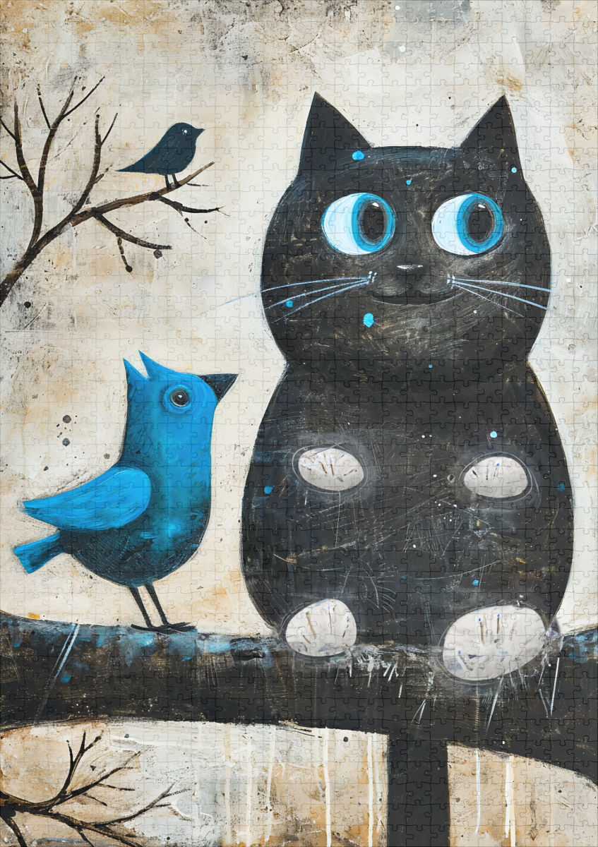 An intriguing illustration of a frightened black cat and a blue bird sharing a branch, both looking cautiously at each other. The artwork showcases a whimsical and playful scene with textured details and vibrant colors.