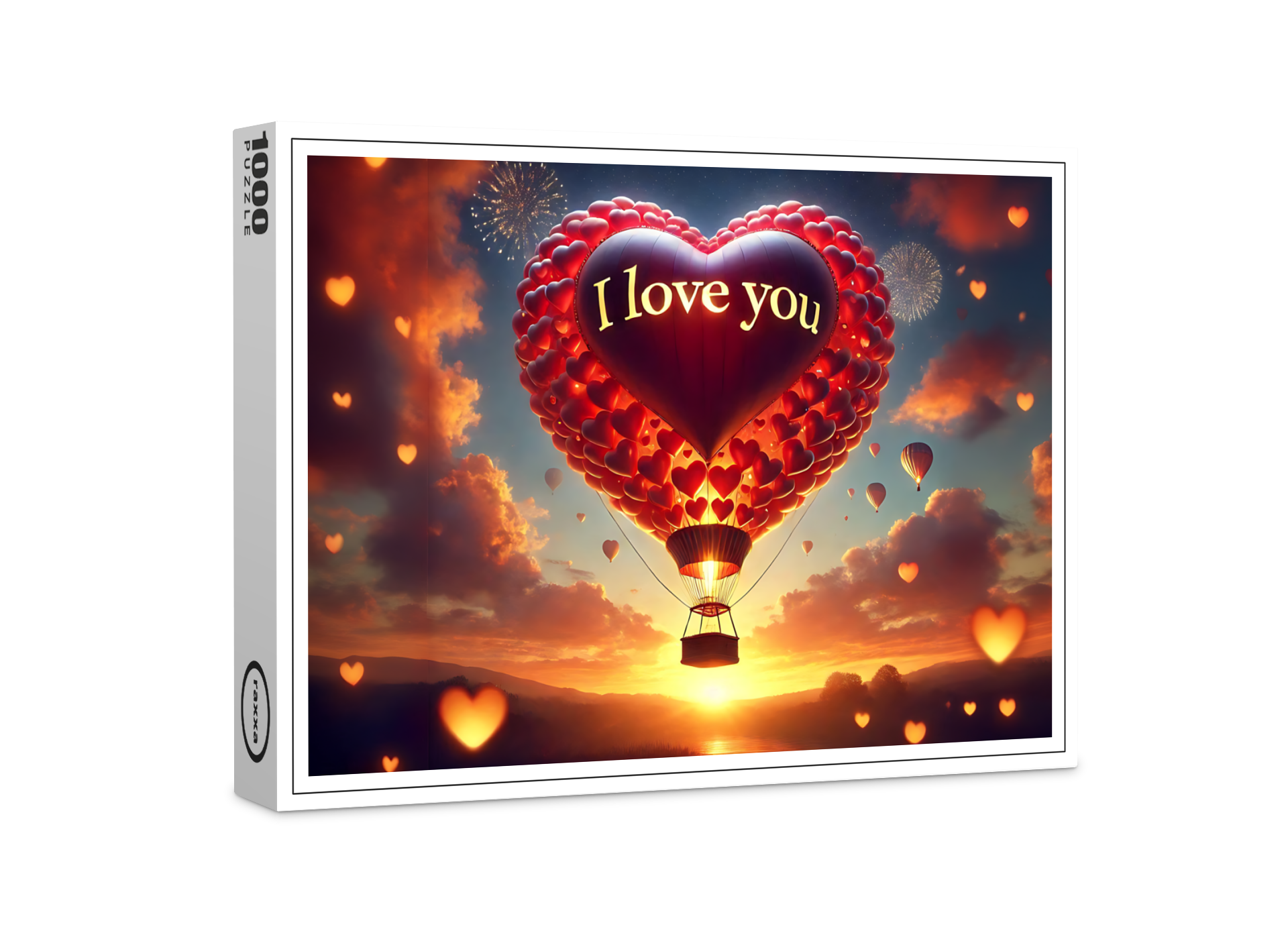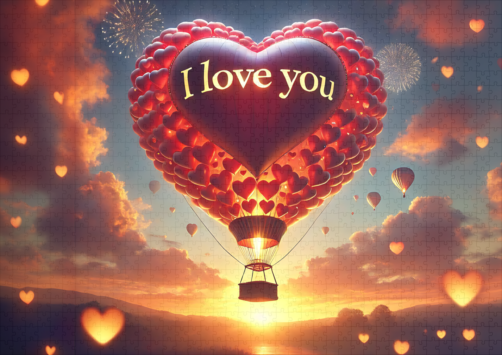 This picture shows a heart-shaped hot air balloon decorated with red hearts and the inscription I love you. There is a beautiful sunset in the background