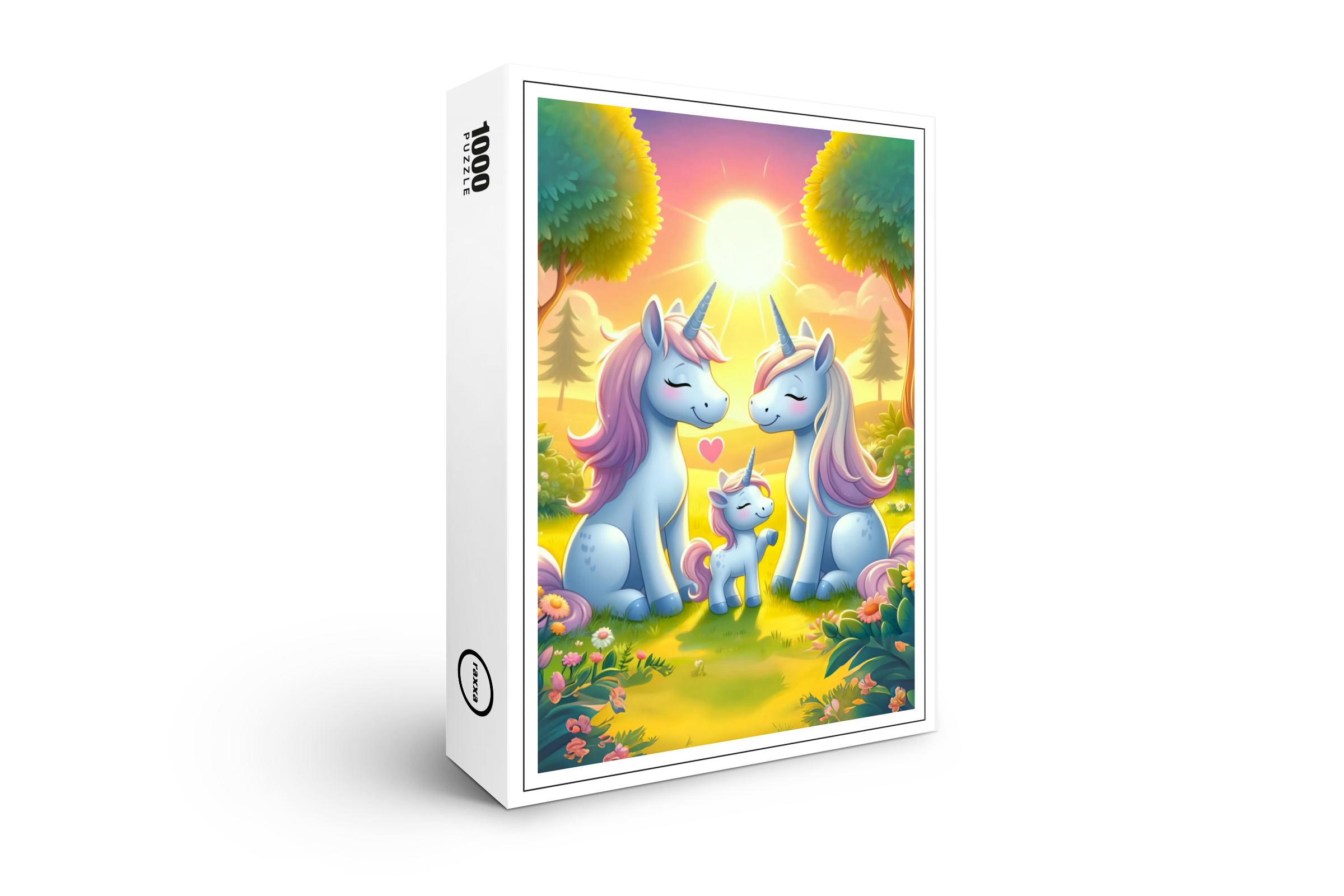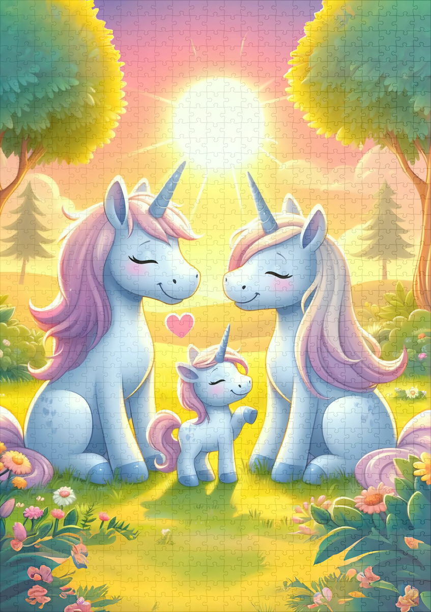 n the forest, surrounded by tall, shady trees, a unicorn family stands with their little unicorn and enjoys the setting sun. The golden rays bathe the scene in warm light and lend it a magical atmosphere. The unicorns stand close together, full of love and harmony, while the tranquil nature silently frames the moment.
