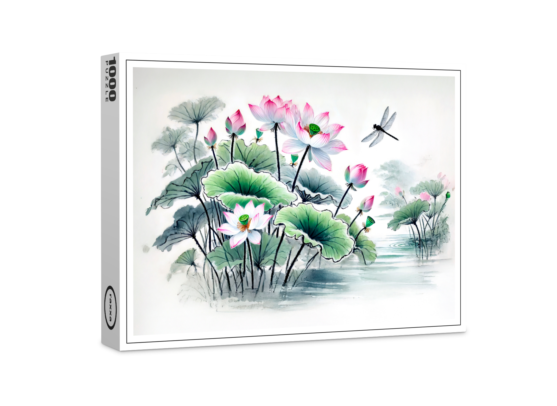 „Lotus and Dragonflies painted in the style of Asian ink art“ by Anja Frost