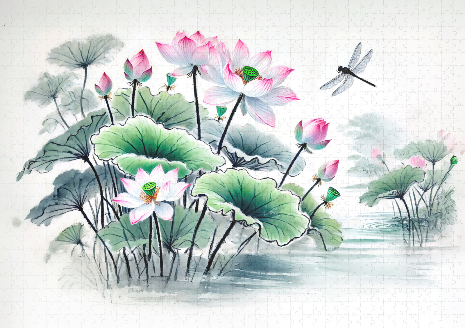 Peaceful lotus blossoms and dragonflies in a soft composition painted in the style of Asian ink art.
