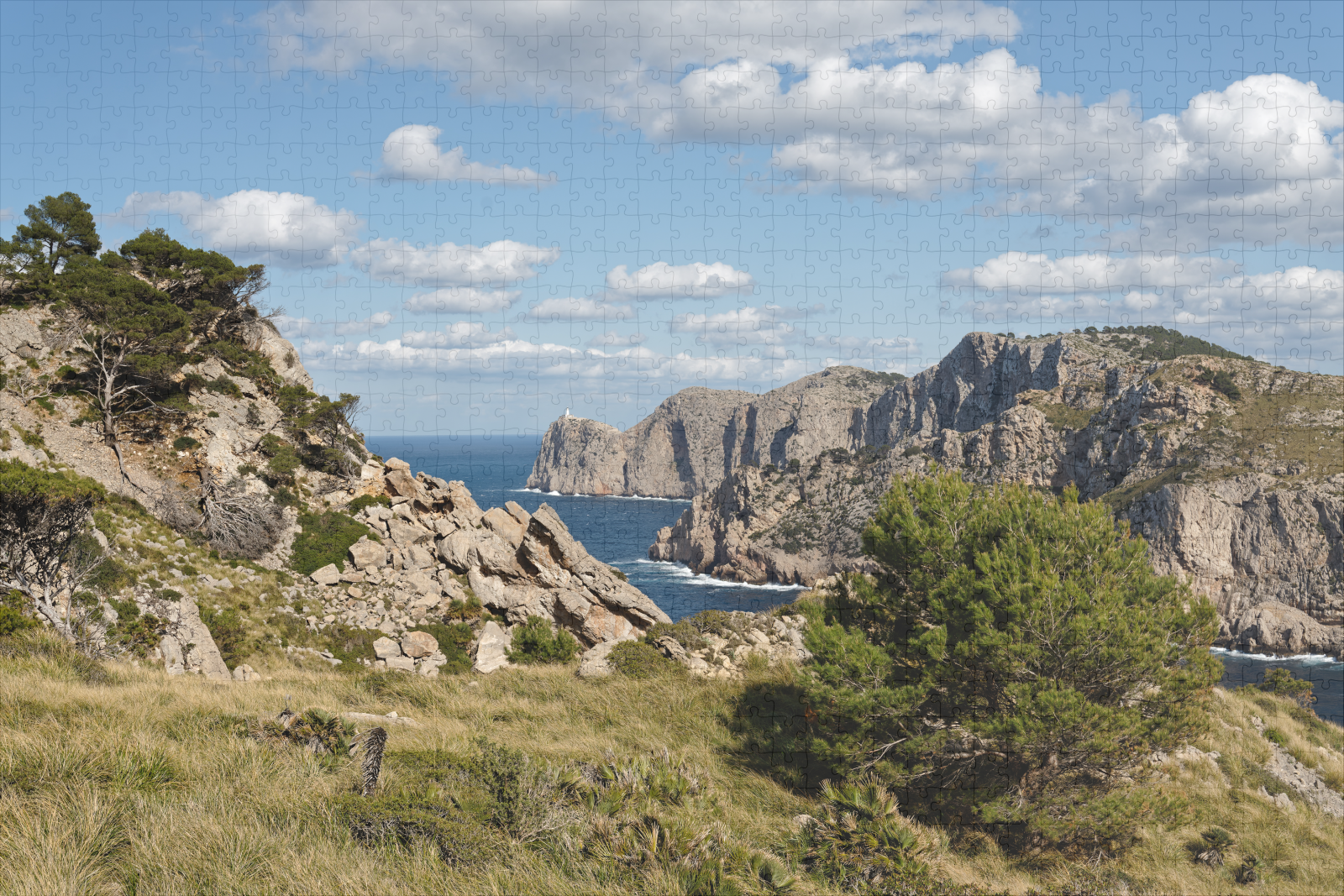 Mallorca - View from the path to Morro de Catalunya to the famous Cap de Formentor with lighthouse, wide view over the bay Cala Figuera to the opposite rocks, tree and rocks in the foreground, sunny weather, light clouds - Location: Spain, Island Mallorca, Peninsula Formentor, Morro de Catalunya