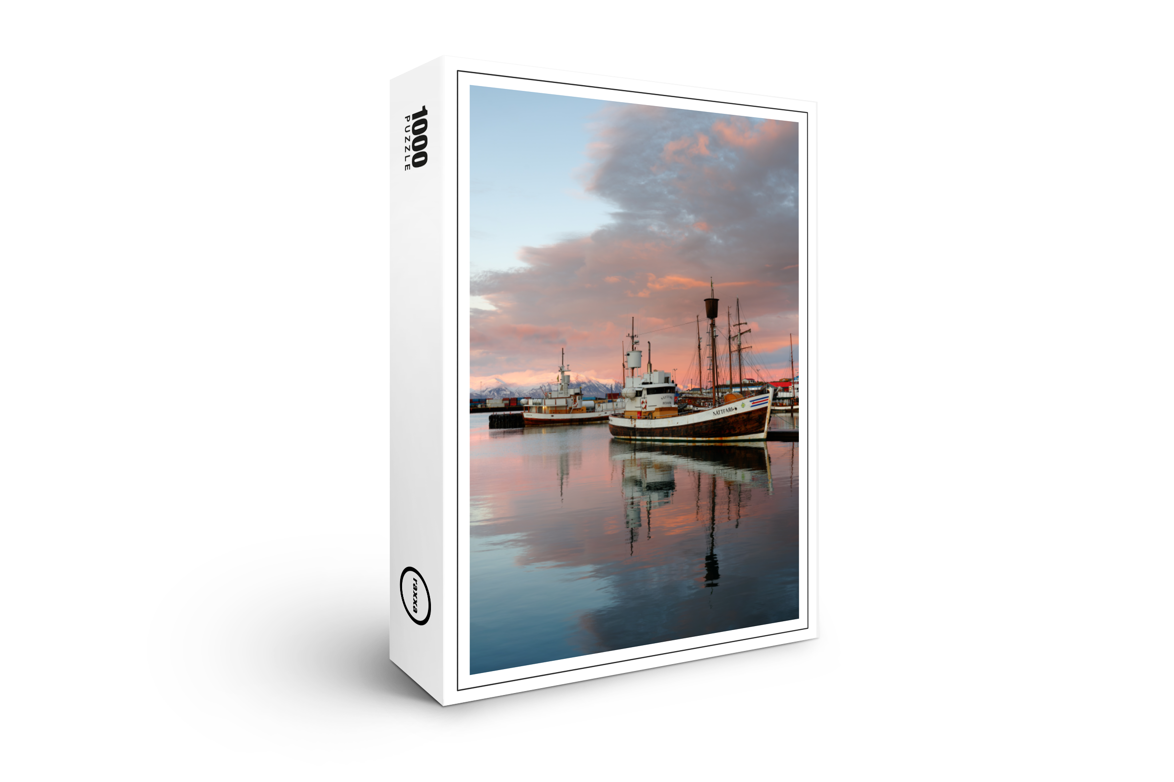 Red morning light at the harbor of the northern Icelandic town of Husavik, ships reflected in the water, clouds in red tones in the sky, mountain range with snow in the background - Location: Iceland, North Coast, Husavik (Húsavík)