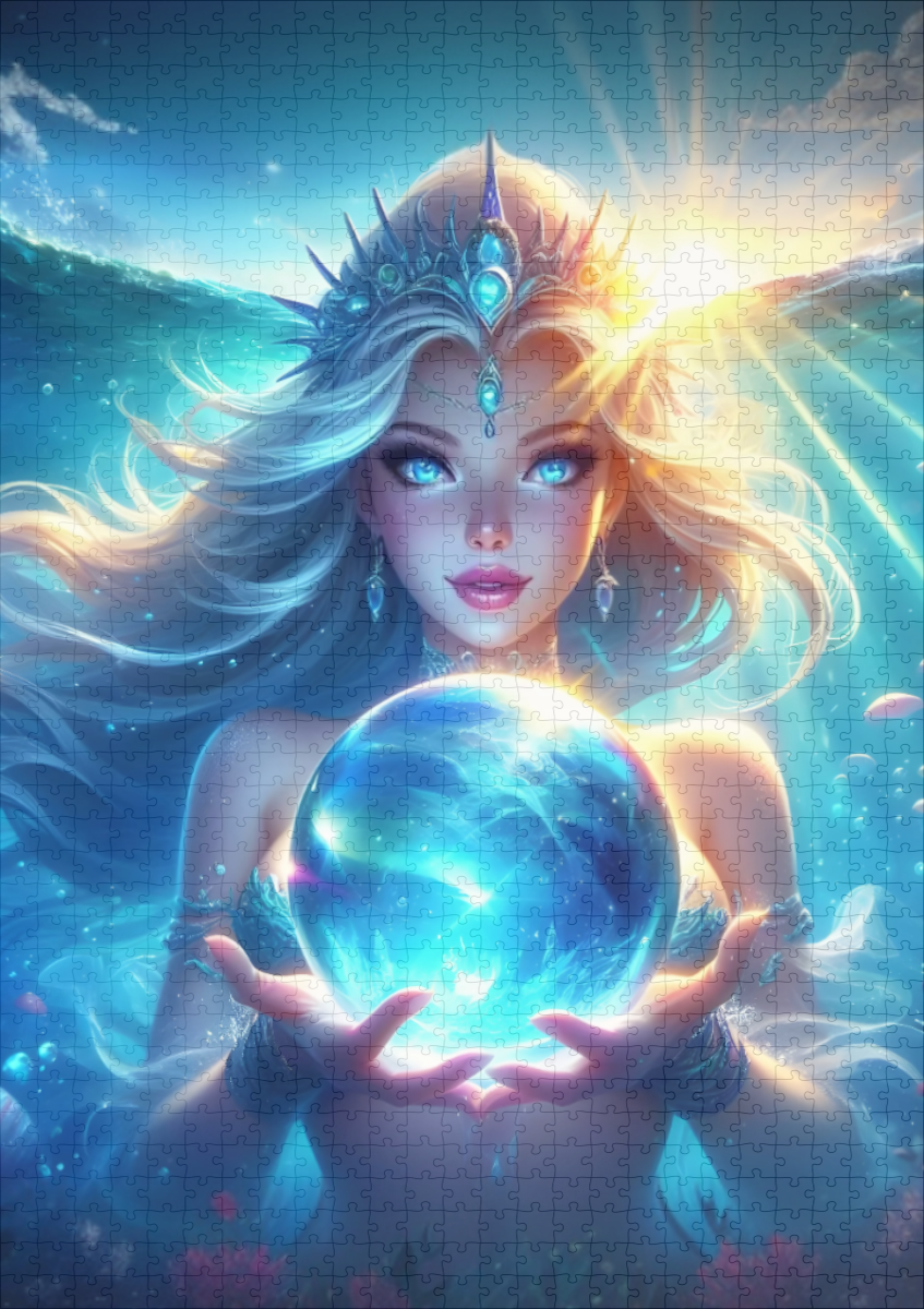 The enchanting Nixia presents a blue crystal ball under water. The sight of her exudes magic in the gentle dance of the ocean currents.