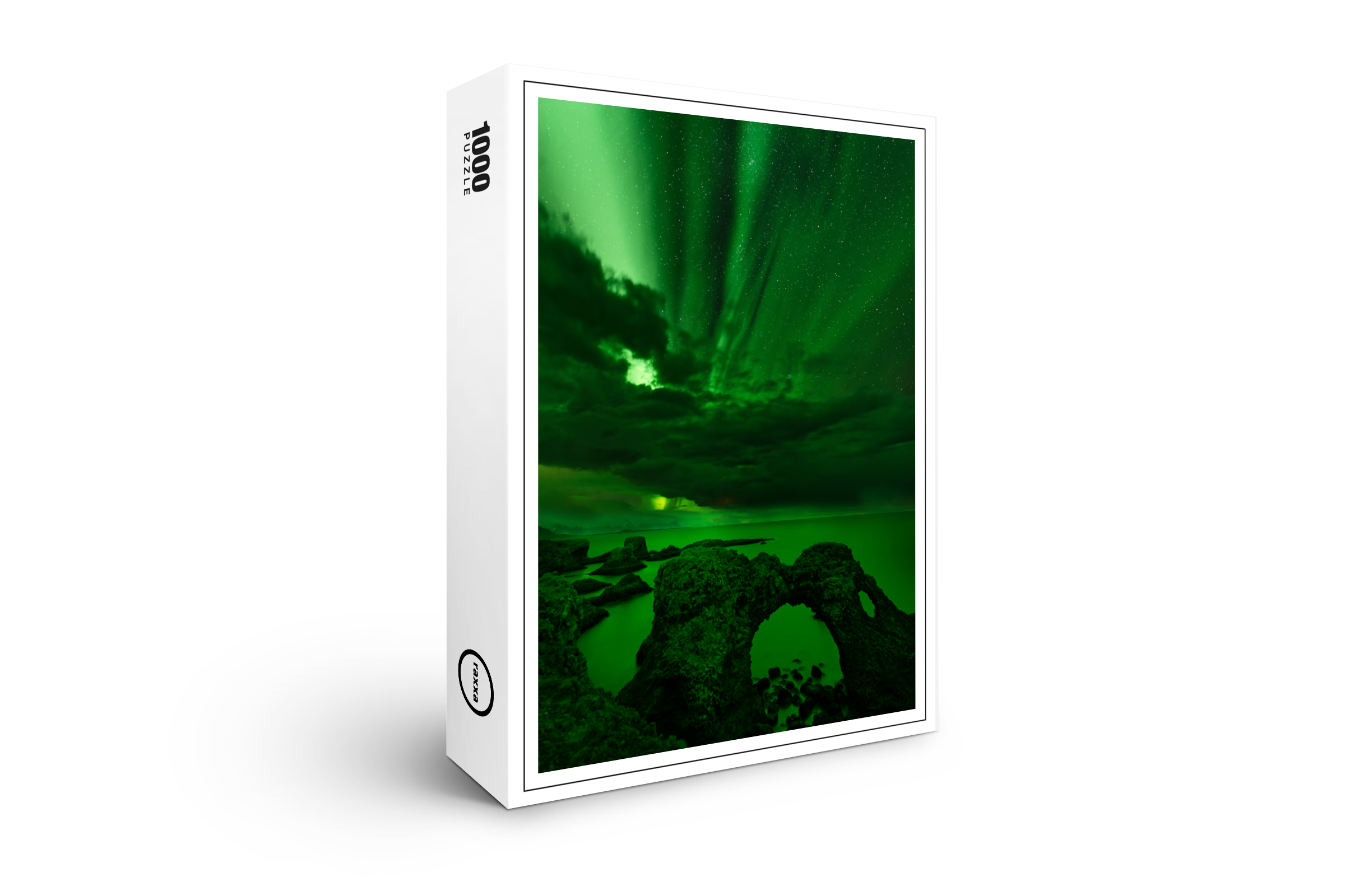 Bright aurora borealis and starry sky above a rocky gate on the cliffs, some clouds additionally enliven the scene - Location: Iceland, Snaefellsnes (Snæfellsnes), Anarstapi