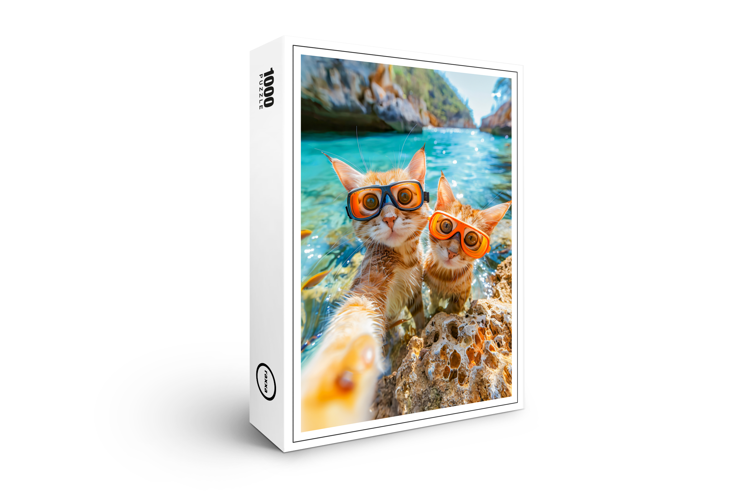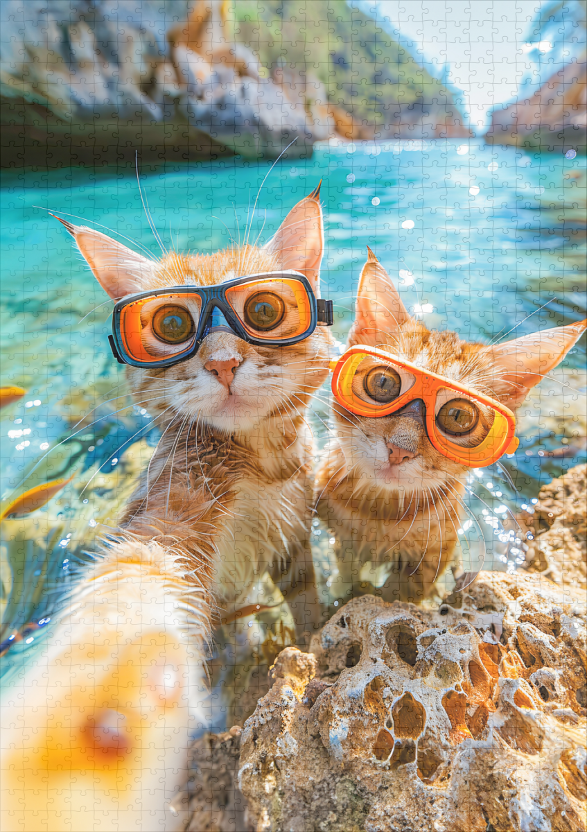 Two playful cats taking a snorkeling selfie in the clear blue waters of the Mediterranean. Fun and summer adventure combined.