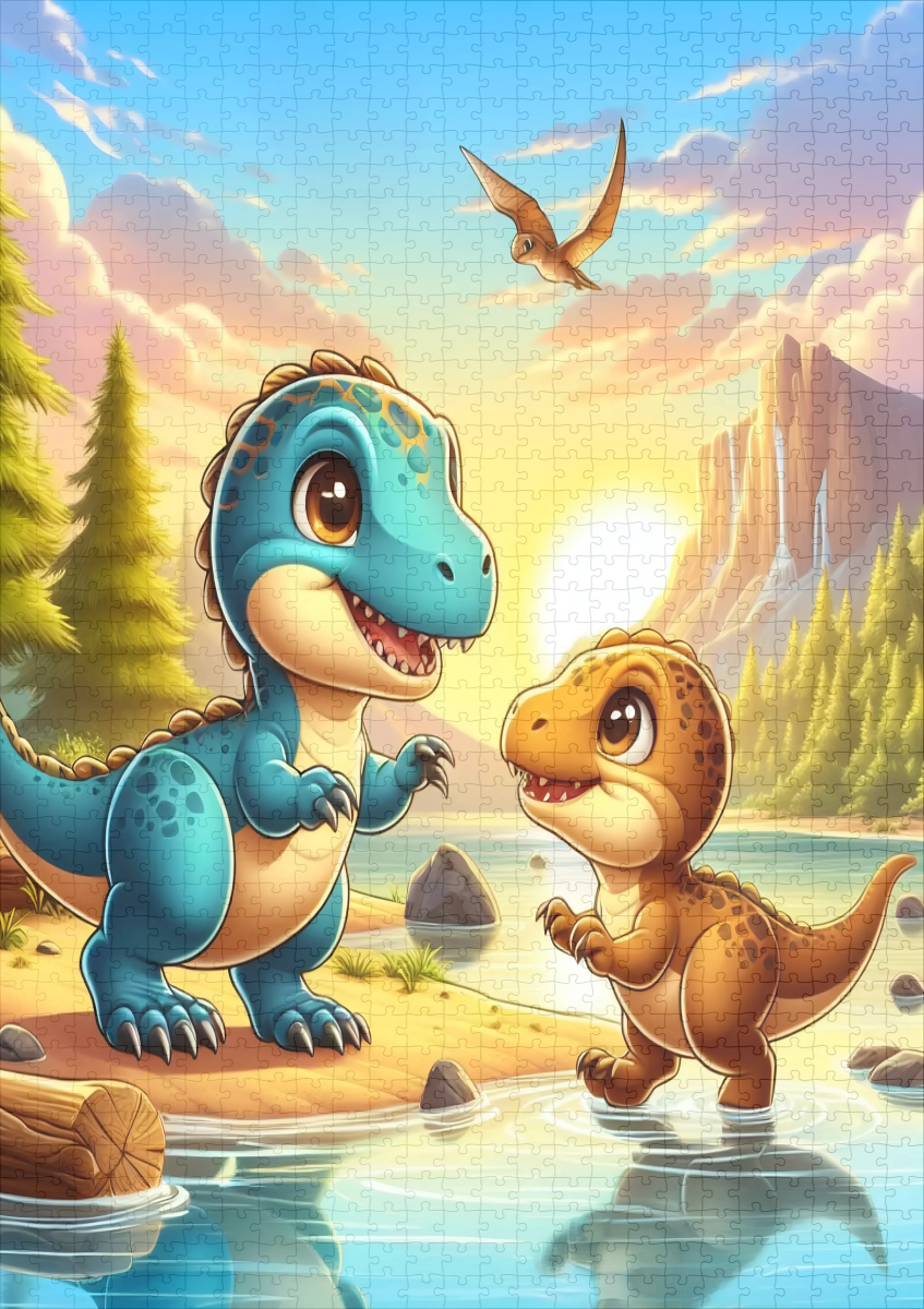 Two playful dinosaur children frolic on the banks of a clear river, splashing in the water and enjoying nature. In the background, majestic mountains and a dense forest frame the scene. The dinosaurs look lively and happy as they experience togetherness and freedom in the natural environment.