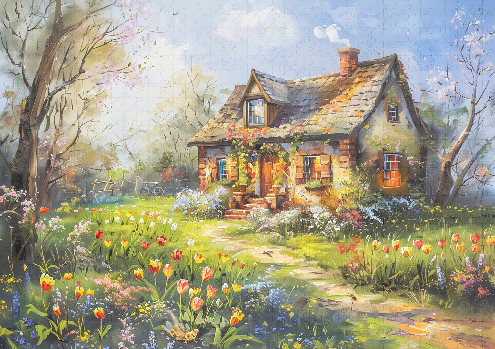 tranquil countryside cottage surrounded by blooming wildflowers and fluttering butterflies, depicted in vibrant oil painting strokes.