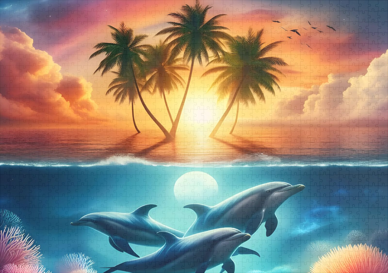 Auf dem Bild mit Delfinen, einem atemberaubenden Sonnenuntergang und majestätischen Palmen entfaltet sich eine Szene von unvergleichlicher Schönheit und Harmonie. Der Himmel brennt in den warmen Farben des Sonnenuntergangs, während die letzten Strahlen des Tages das Meer in goldenes Licht tauchen. Die Kombination aus den verspielten Delfinen, dem malerischen Sonnenuntergang und den im Wind flüsternden Palmen erzeugt eine Atmosphäre der Magie und des Friedens.