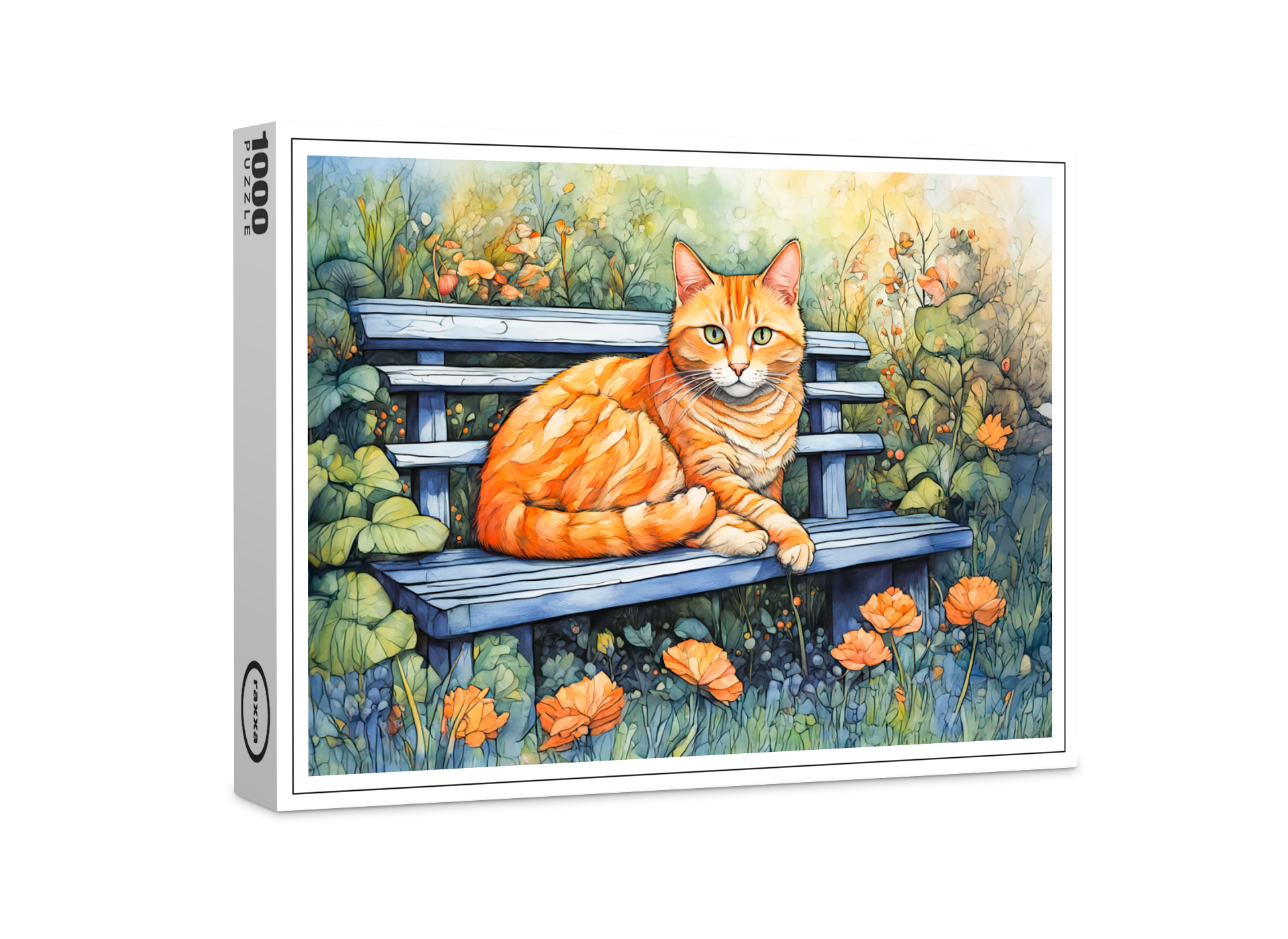 „Watercolor of Cat on Bench in Flower Garden“ by Anja Frost