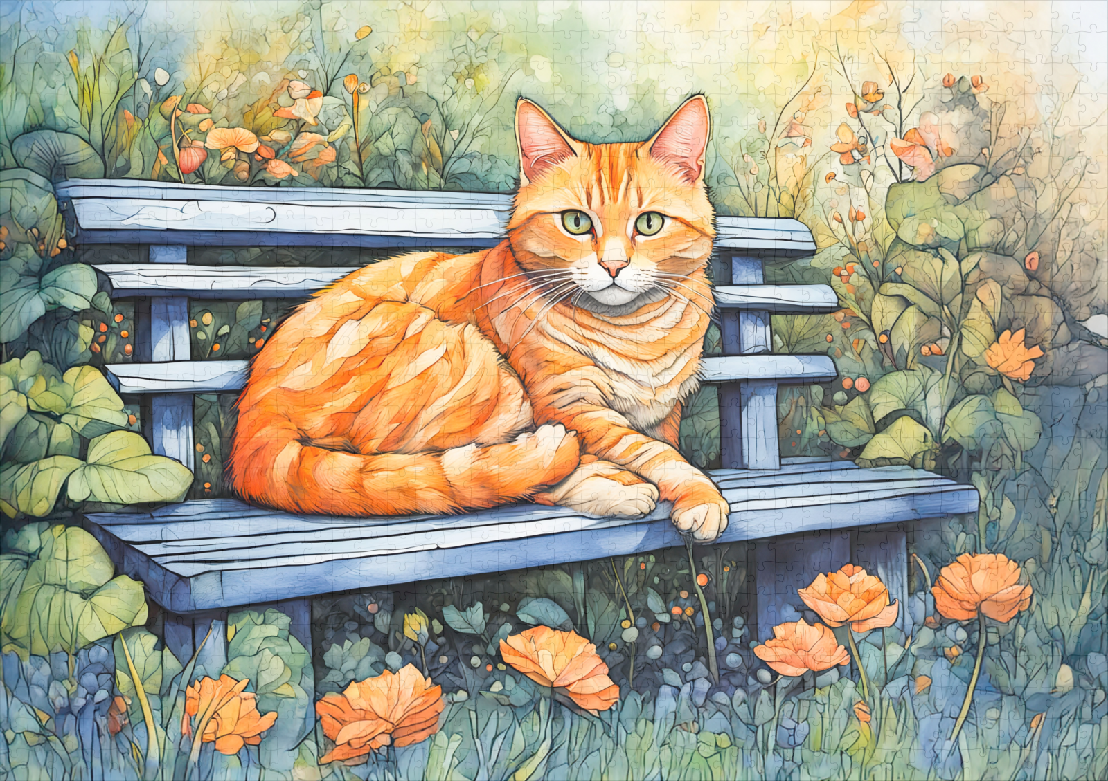orange cat lounges on a wooden bench surrounded by blooming flowers in a lush garden.