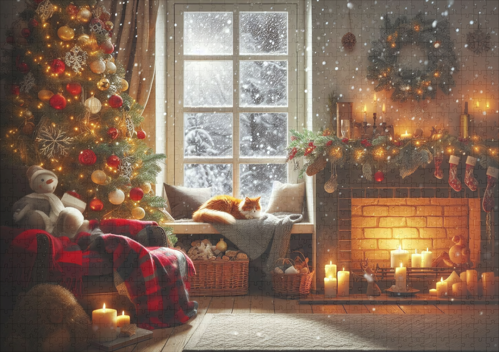 A cozy living room with a snowy view through the window. On the left is a large, decorated Christmas tree with twinkling baubles and lights. To the right of the window is a festively decorated fireplace with flickering candles. A warm, festive Christmas atmosphere fills the room.