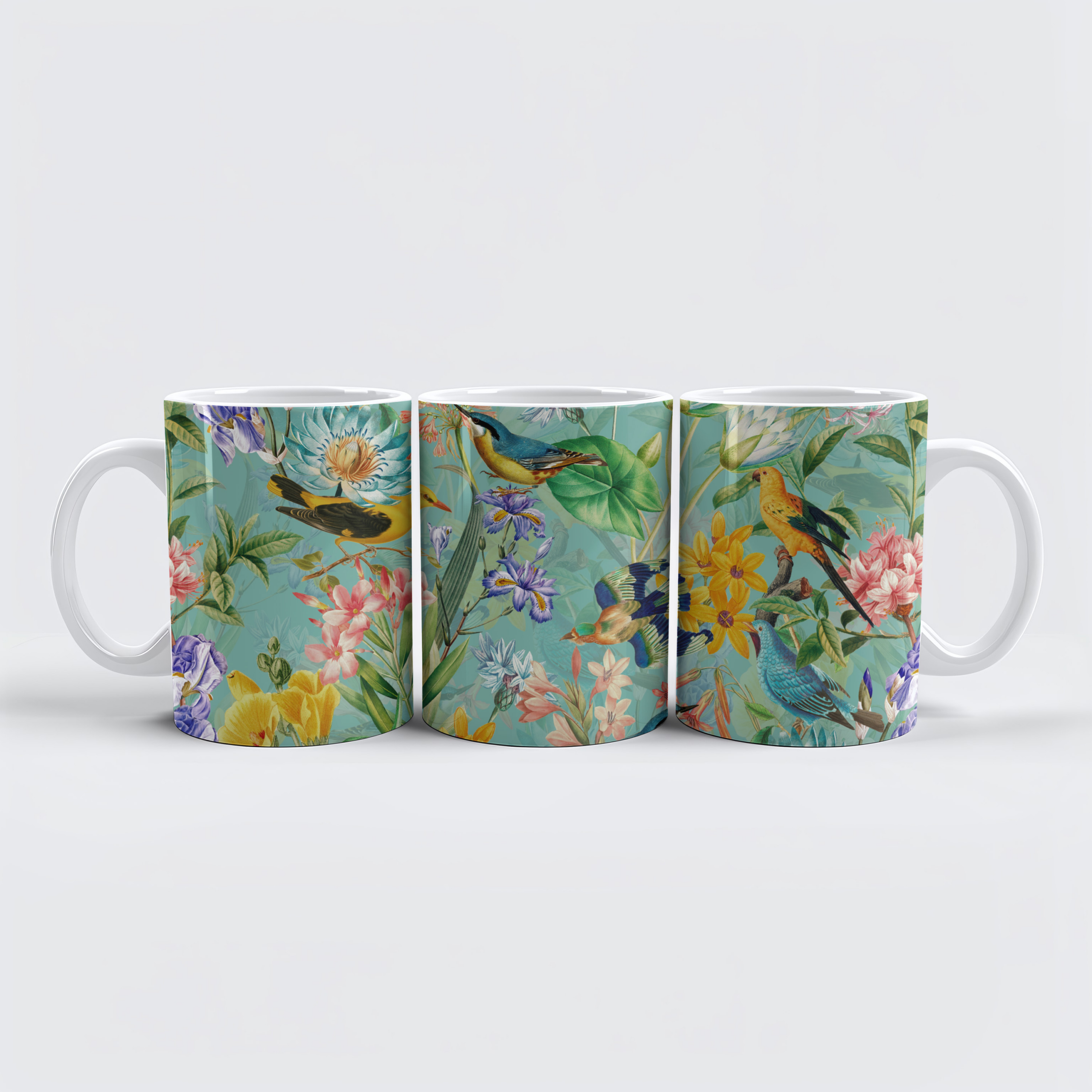 A vintage turquoise pattern with a tropical and exotic flair presents a sensual ode to nature. Gorgeous, exotic flowers in vibrant colors bloom on a background of rich green and deep blue. Exotic birds with their colorful feathers fly majestically through the scene and lend the pattern a lively touch. The luxurious details and embellishments in this design create an opulent atmosphere that beguiles the senses. This exotic vintage pattern embodies the allure and richness of tropical nature and exudes a timeless elegance that will transform any room into a luxurious paradise.