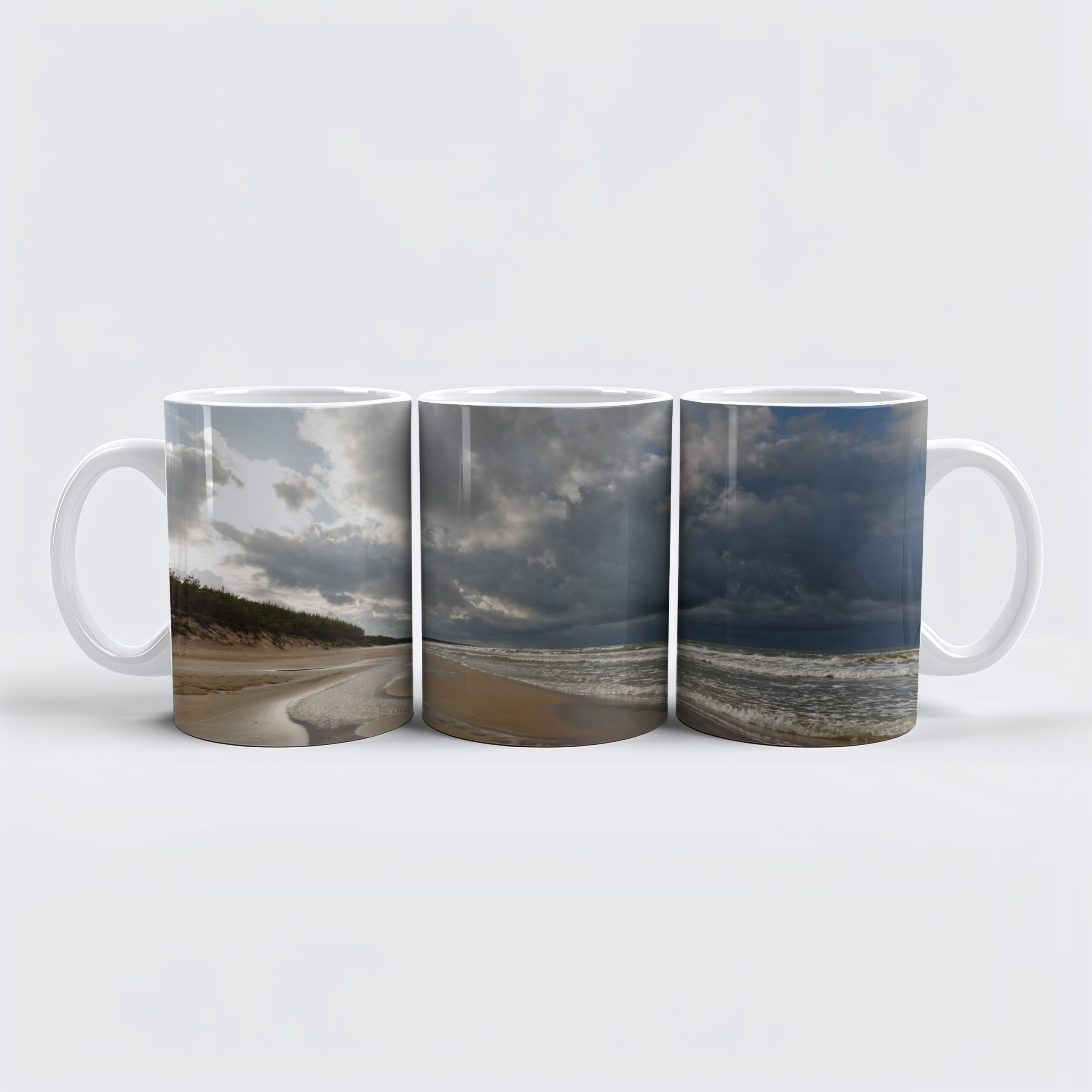 Weiter Blick über einen menschenleeren Strandabschnitt, im Vordergrund Flachwasserflächen mit Blickführung zum Horizont, darüber teilweise dramatische Wolken, die einen Wetterwechsel ankündigen – Location- Polnische Ostseeküste, Slowinski Park Narodowy (Slowinzischer Nationalpark)