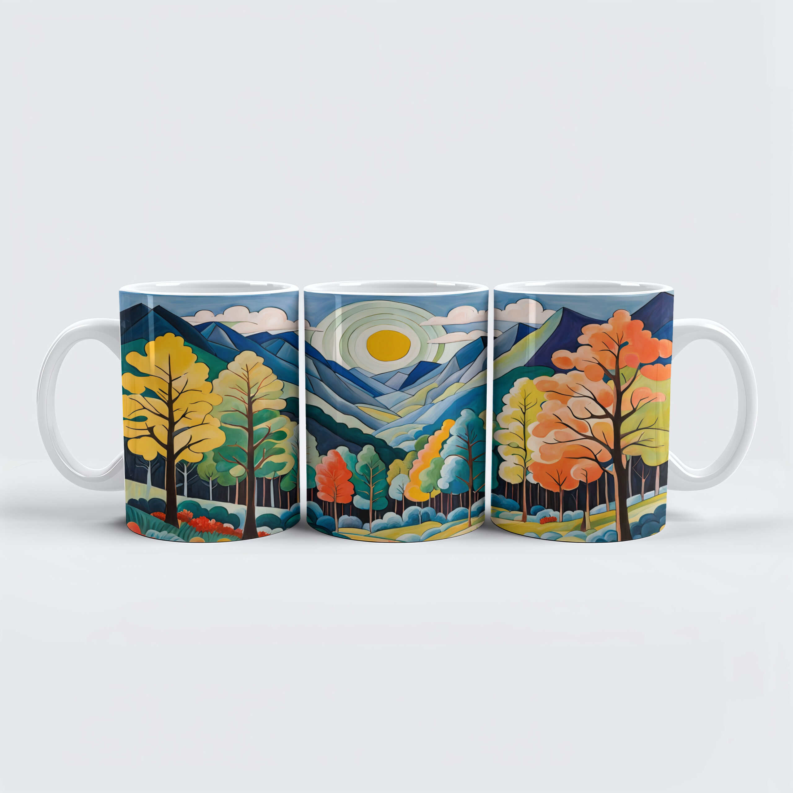 scenic mountainous autumn landscape featuring a winding trail leading into the hills. Colorful trees in shades of yellow, red, green, and blue create a vibrant and picturesque scene.