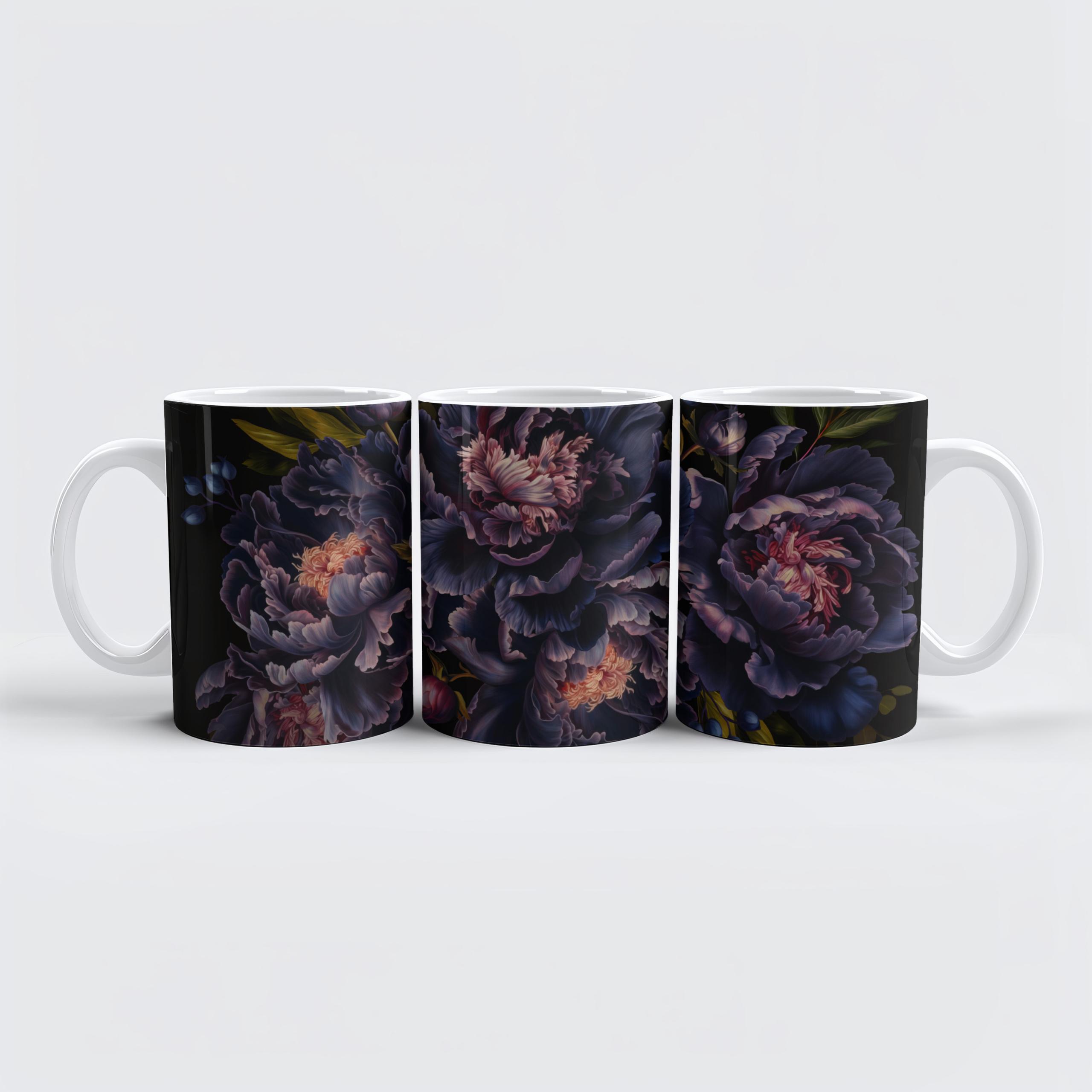 This nostalgic gothic floral design features lush peonies and dark blue and purple roses arranged in an opulent floral arrangement on a dark background. The large-flowered roses and peonies radiate a dark romanticism, while the dark background accentuates their beauty even more. This arrangement exudes luxury and vintage romance, reminiscent of a bygone era when floral arrangements served as symbols of passion and splendor. It creates an elegant and mysterious atmosphere that fills the room with nostalgic allure and focuses on the dark romance of the flowers.