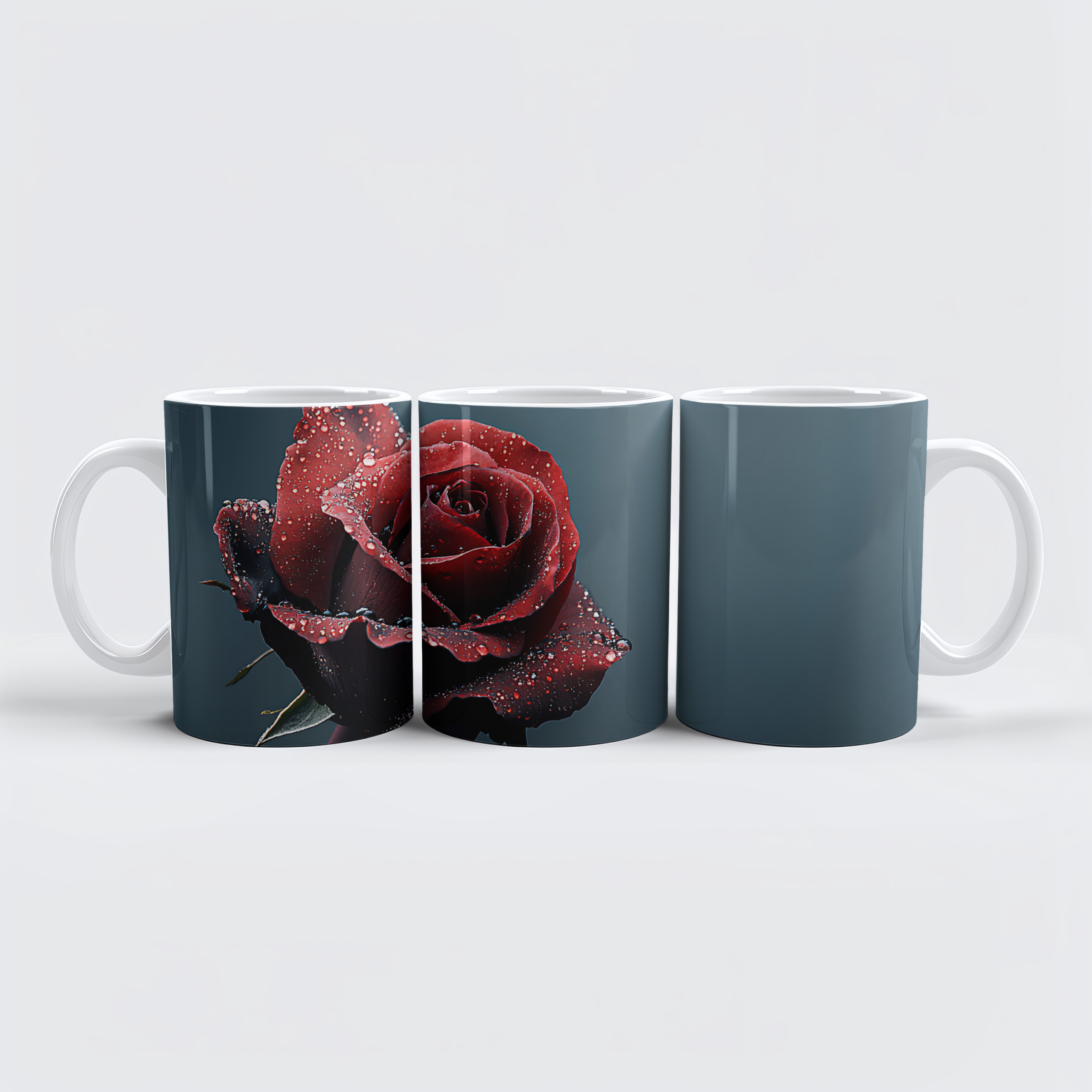 Red rose with water droplets on the petals on a soft, blurred background.