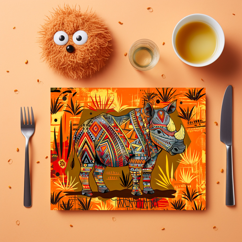 A single African rhino with bold tribal patterns, standing in a stylized savanna scene painted in African folk art style