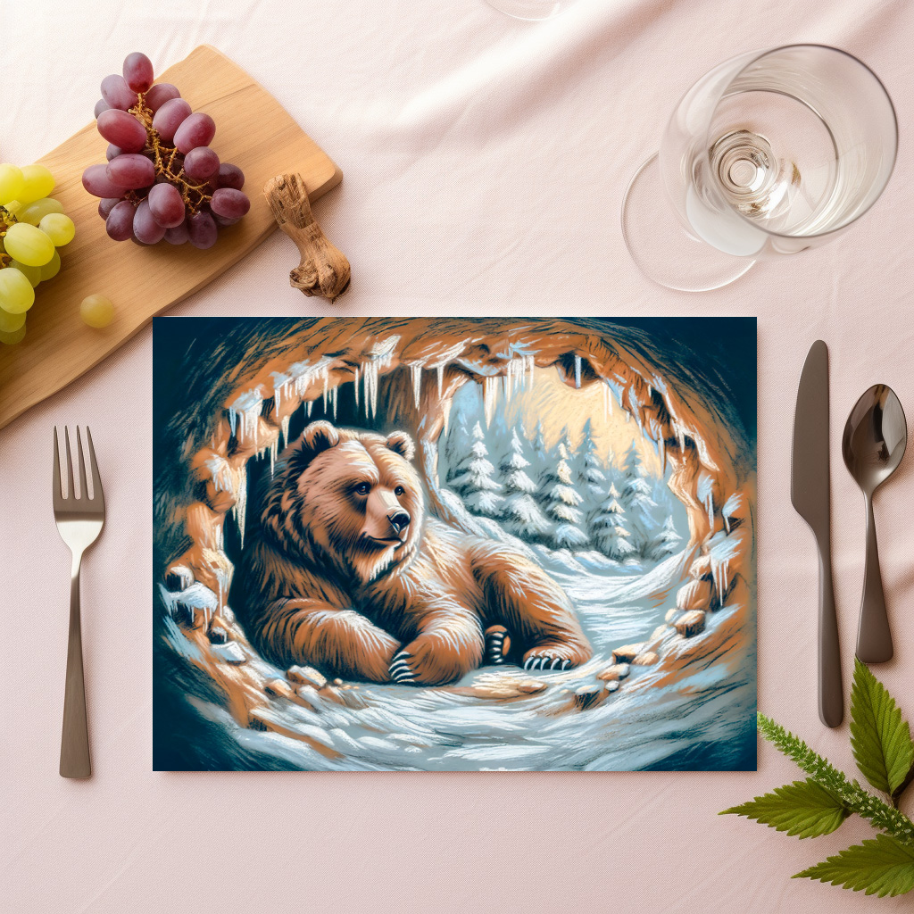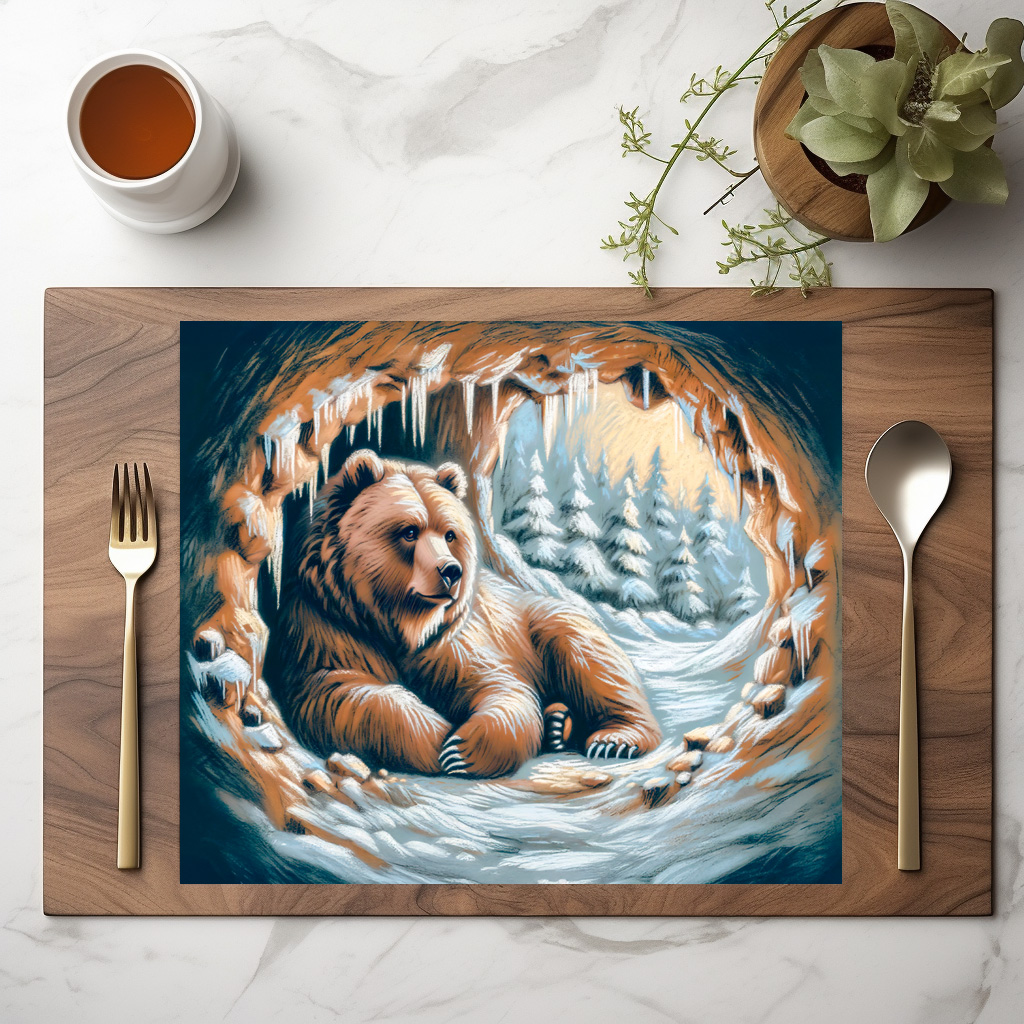 brown bear rests in a snowy cave, surrounded by icicles and a peaceful winter forest. This pastel chalk drawing captures the warmth and tranquility of hibernation in nature.