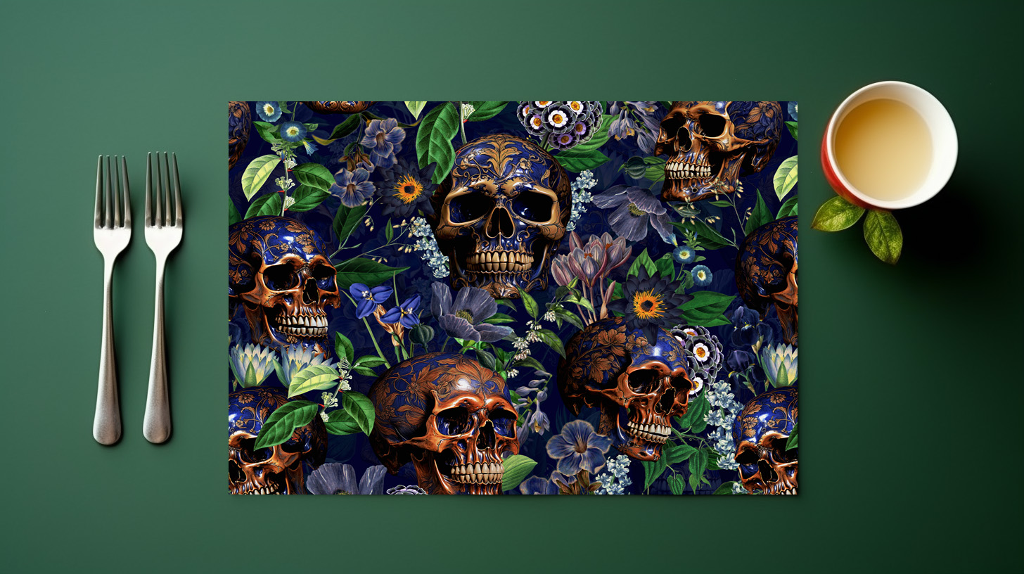 A vintage pattern design that combines skull motifs in deep brown tones with washed-out, vintage blue flowers. The brown skulls give the pattern a dark and mysterious aura, while the vintage blue flowers create a striking contrast and create a mysterious, almost melancholic atmosphere. The darkness of this design conceals a deep emotional depth that draws the viewer into a world of vintage magic and timeless romance.