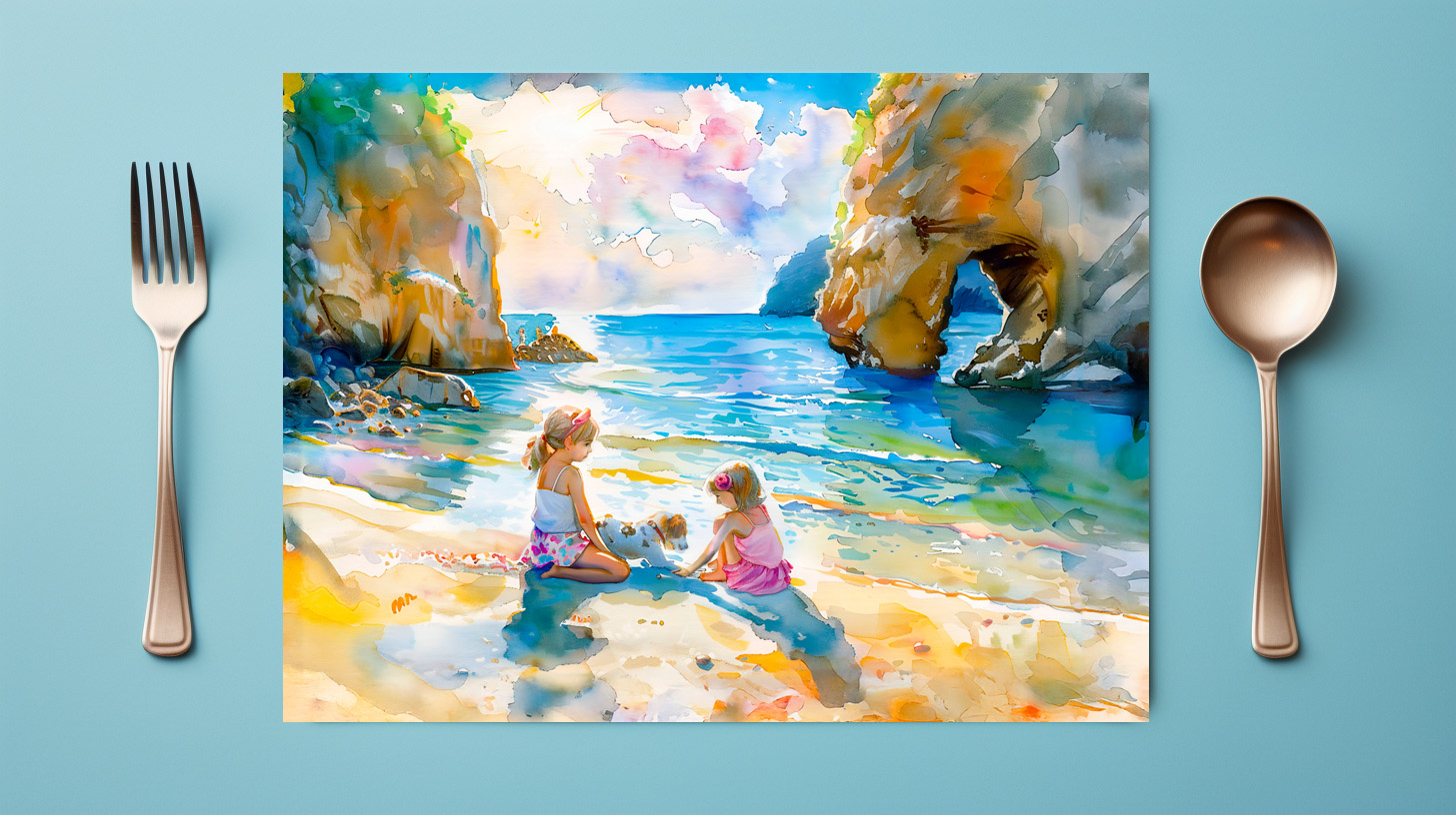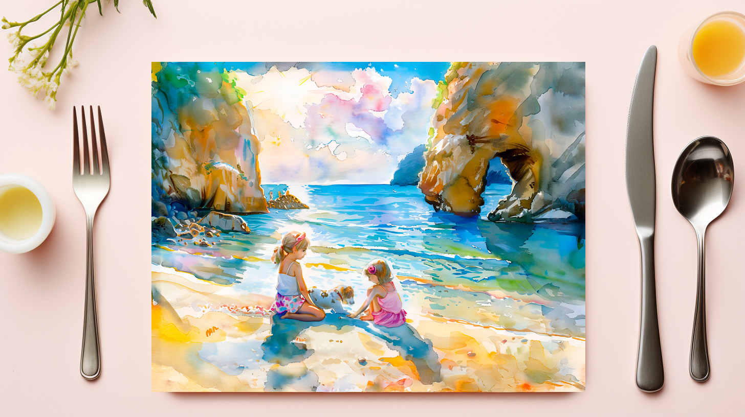 Watercolor painting of two girls playing in sand near a dramatic coastal rock formation by the sea.