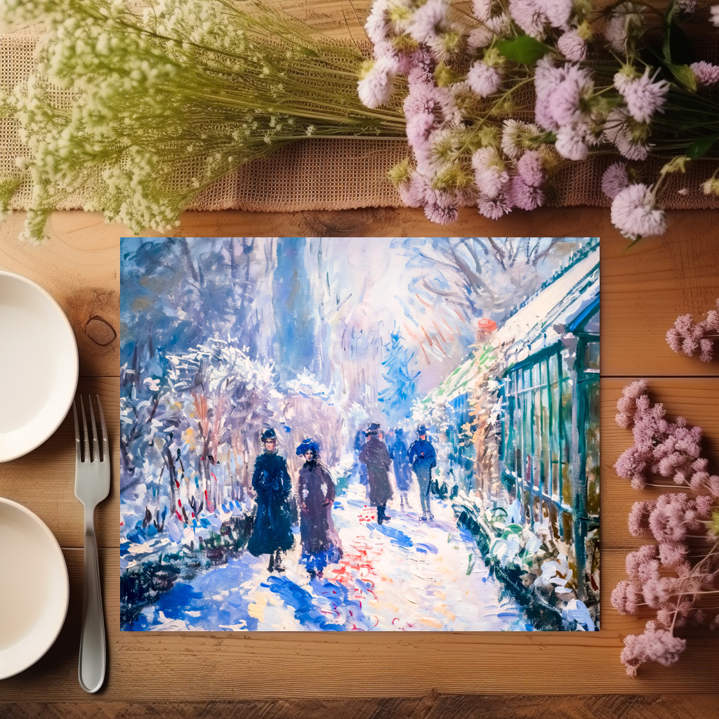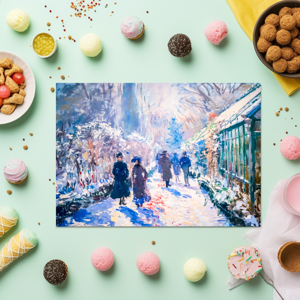 Romantic garden scene painted in an impressionist style, showing snow-covered paths and people strolling through the soft winter light.