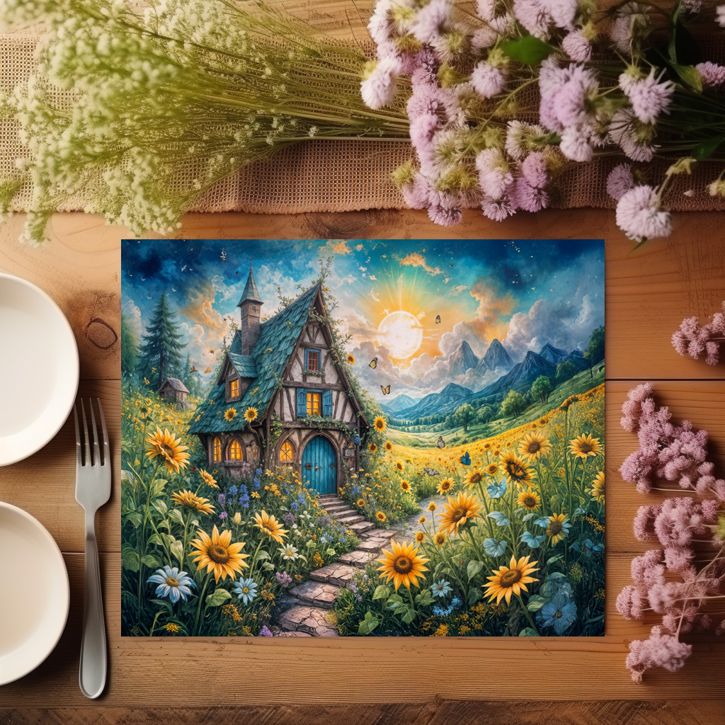 picturesque cottage nestled in a vibrant sunflower field, surrounded by lush greenery and blooming flowers, creating a serene and enchanting atmosphere.
