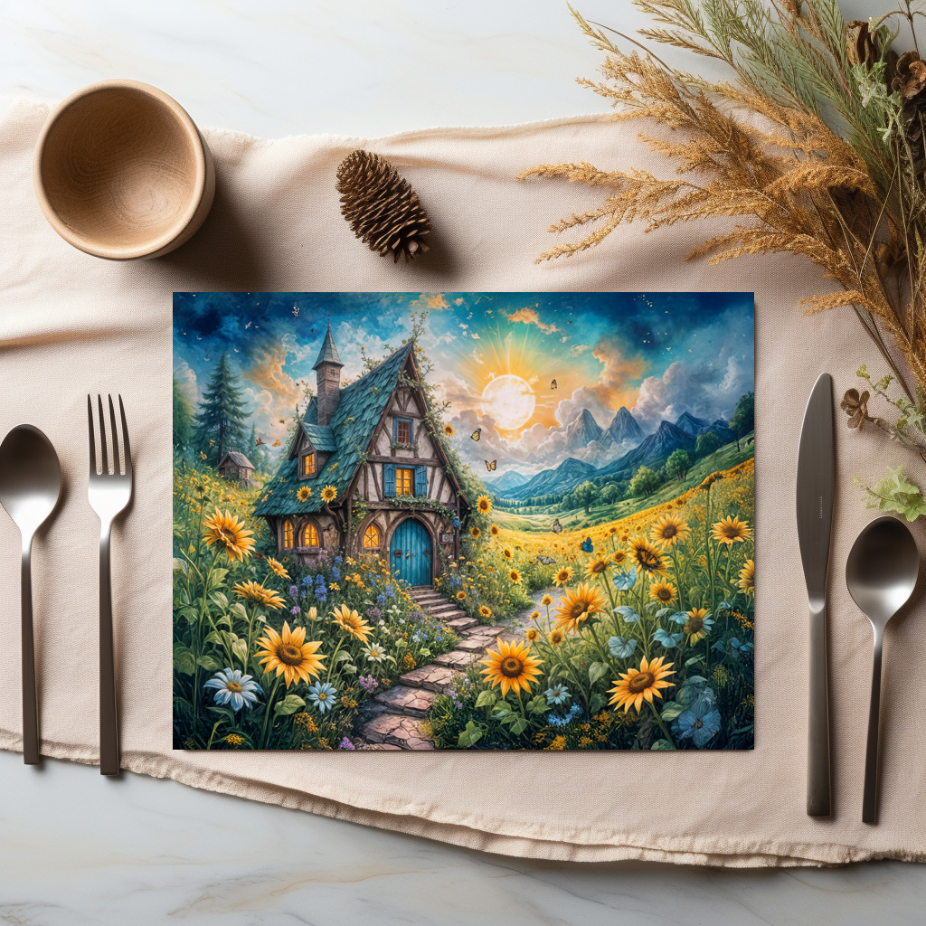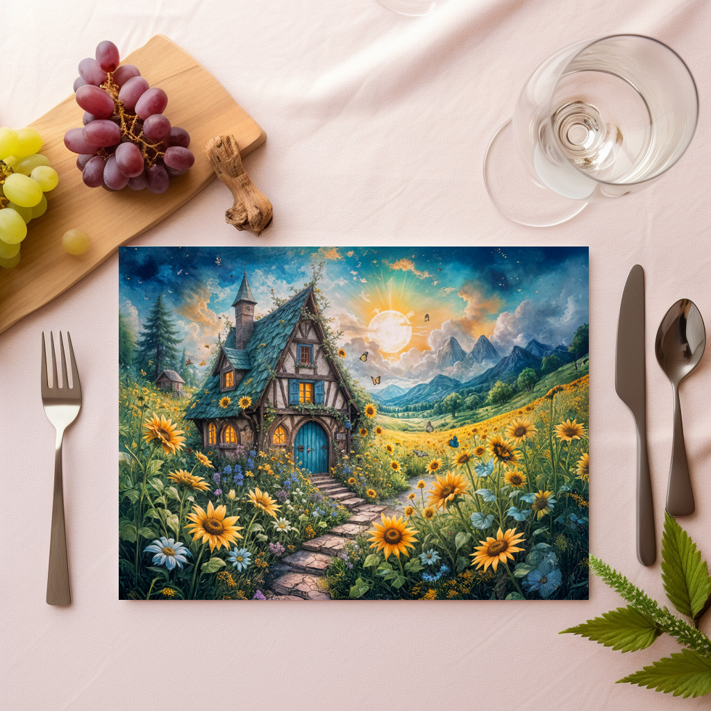 "Magical Cottage with Sunflower Field" by Anja Frost