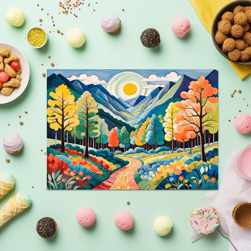scenic mountainous autumn landscape featuring a winding trail leading into the hills. Colorful trees in shades of yellow, red, green, and blue create a vibrant and picturesque scene.