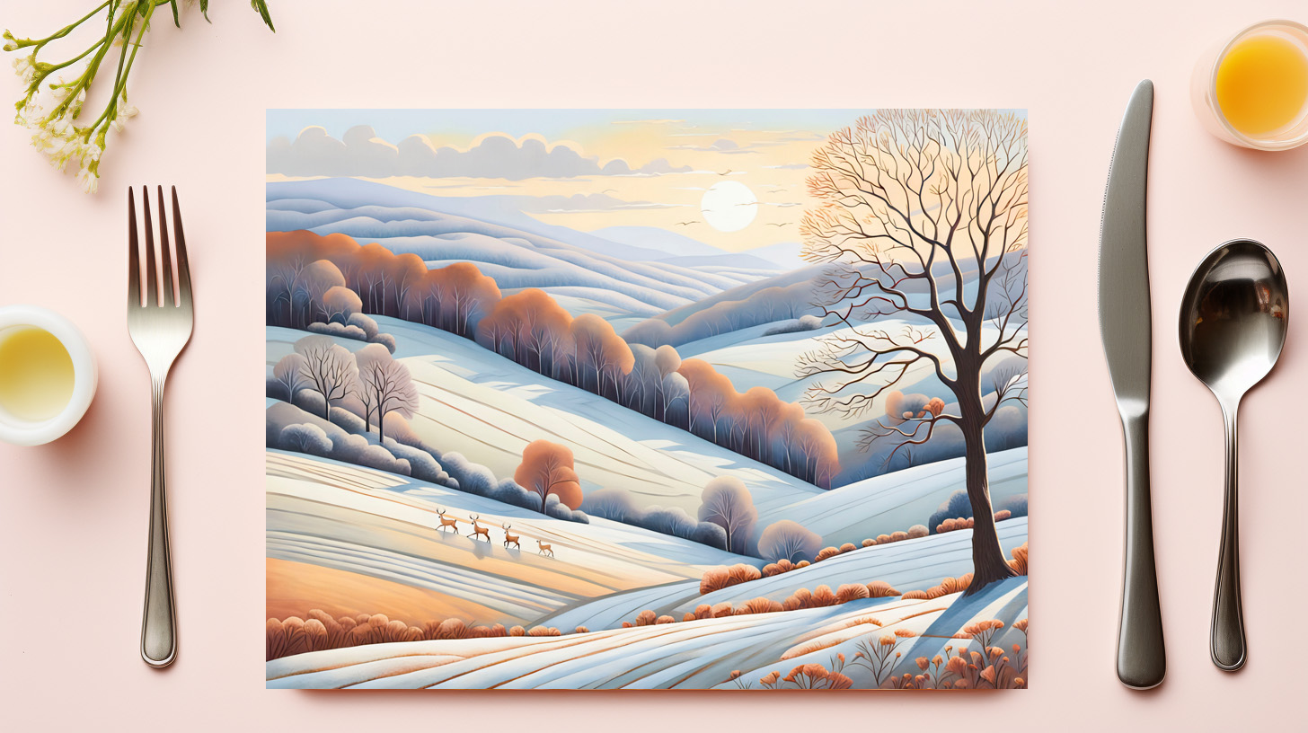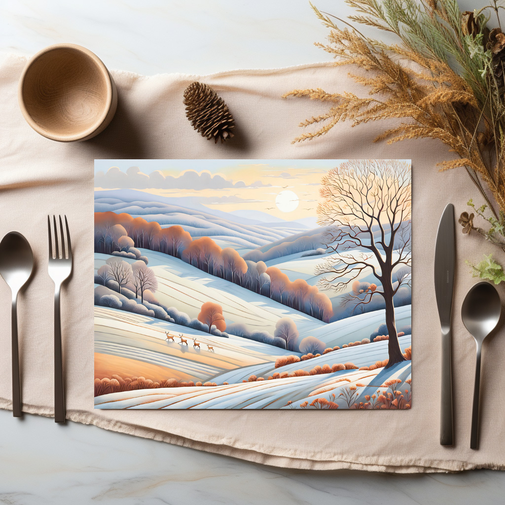 Sunny winter landscape with rolling hills covered in snow. Gentle sunlight casts a warm glow over the picturesque countryside. Pastel watercolor style.