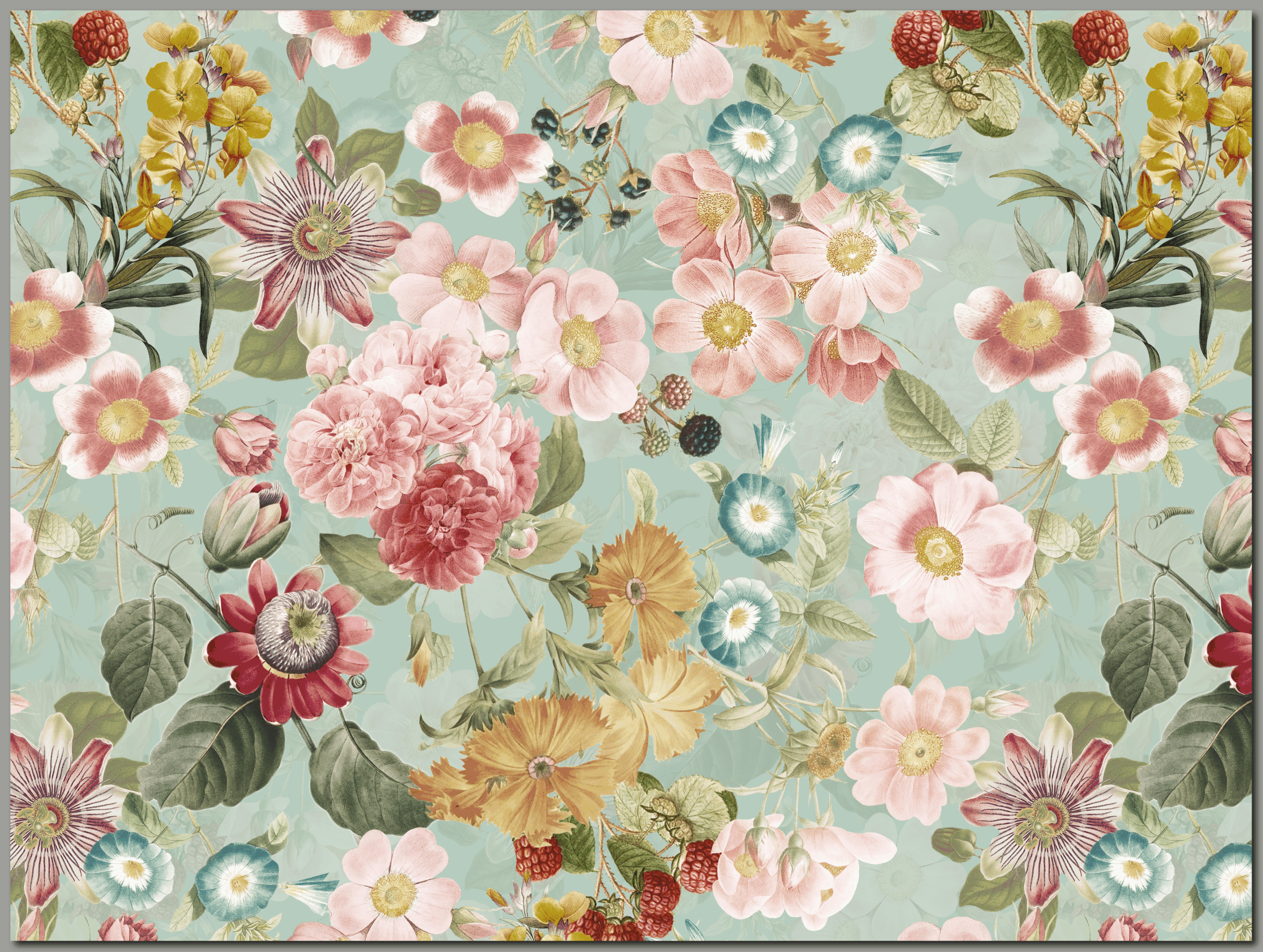 This nostalgic rose pattern presents artfully hand-painted roses, inspired by masters of past eras such as Pierre-Joseph Redouté, harmoniously combined with an abundance of other delicate flowers. The roses, in delicate pink, form the centerpiece and are framed by filigree green leaves. In this pattern, the roses merge with carnations, ipomea, passionflowers and other flowers to create a symphony of elegance and romance.