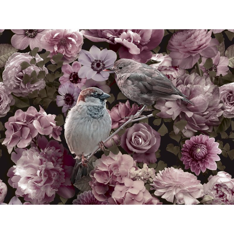Seamless design of nostalgic vintage rose and peonies with cute sparrow bird in a soft pastel pink