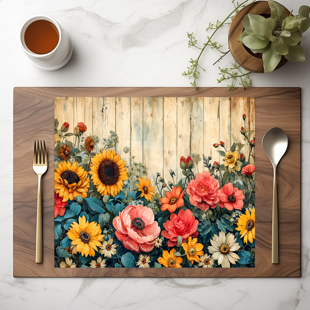 garden-inspired mix of bold sunflowers, soft pink roses, and tiny wildflowers arranged on weathered wood. A cozy rustic bouquet with farmhouse flair.