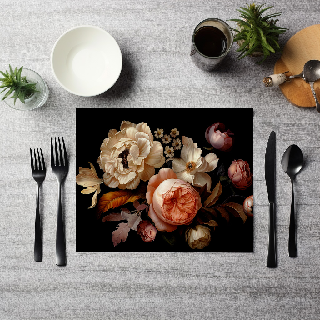 This nostalgic gothic floral design presents an opulent arrangement of lush peonies and roses that stand out against a dark, mysterious background. The flowers are artfully arranged and are reminiscent of the splendor of bygone eras, when floral arrangements served as an expression of luxury and romance. The deep, dark shades of the flowers and the background create a fascinating atmosphere that radiates both sombre beauty and timeless elegance. This floral masterpiece draws the viewer into a world of mysterious romance and nostalgic allure.