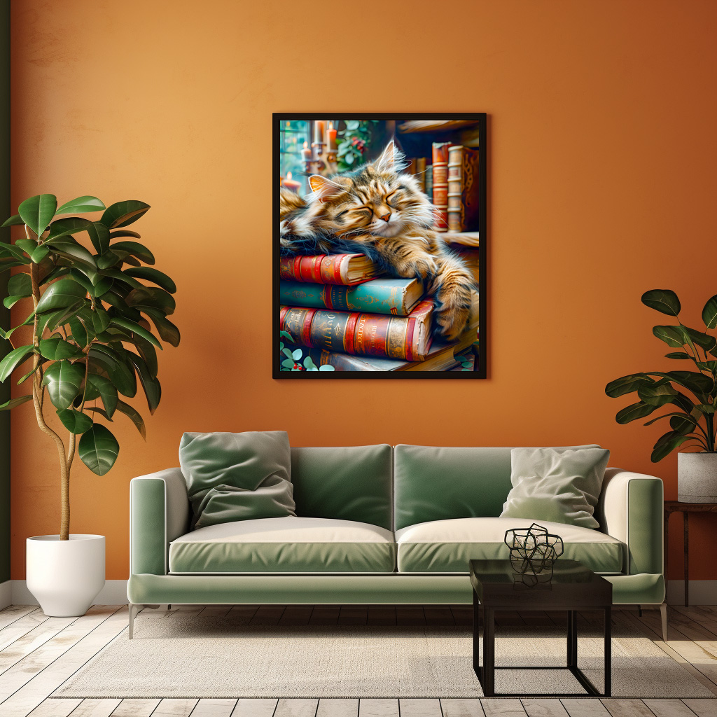 "Cozy Cat Napping in Comfortable Book Setting" by Anja Frost