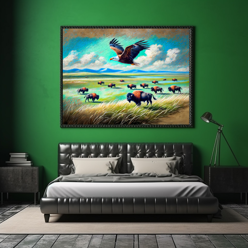 eagle soars above a herd of buffalo in the wide plains of North America, symbolizing freedom and the untamed wild. This pastel chalk drawing beautifully captures the iconic wildlife of the region