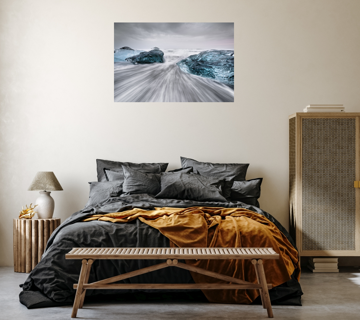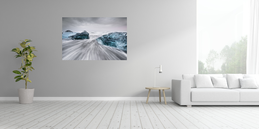 Bloques de hielo en tonos azules sobre una playa negra con fuerte oleaje, se aprecia el movimiento del agua (larga exposición, claros rastros de movimiento), sobre un contrastado cielo nublado gris, efecto de profundidad a través de la perspectiva - Ubicación: Islandia, Jökulsarlon (Jökulsárlón)