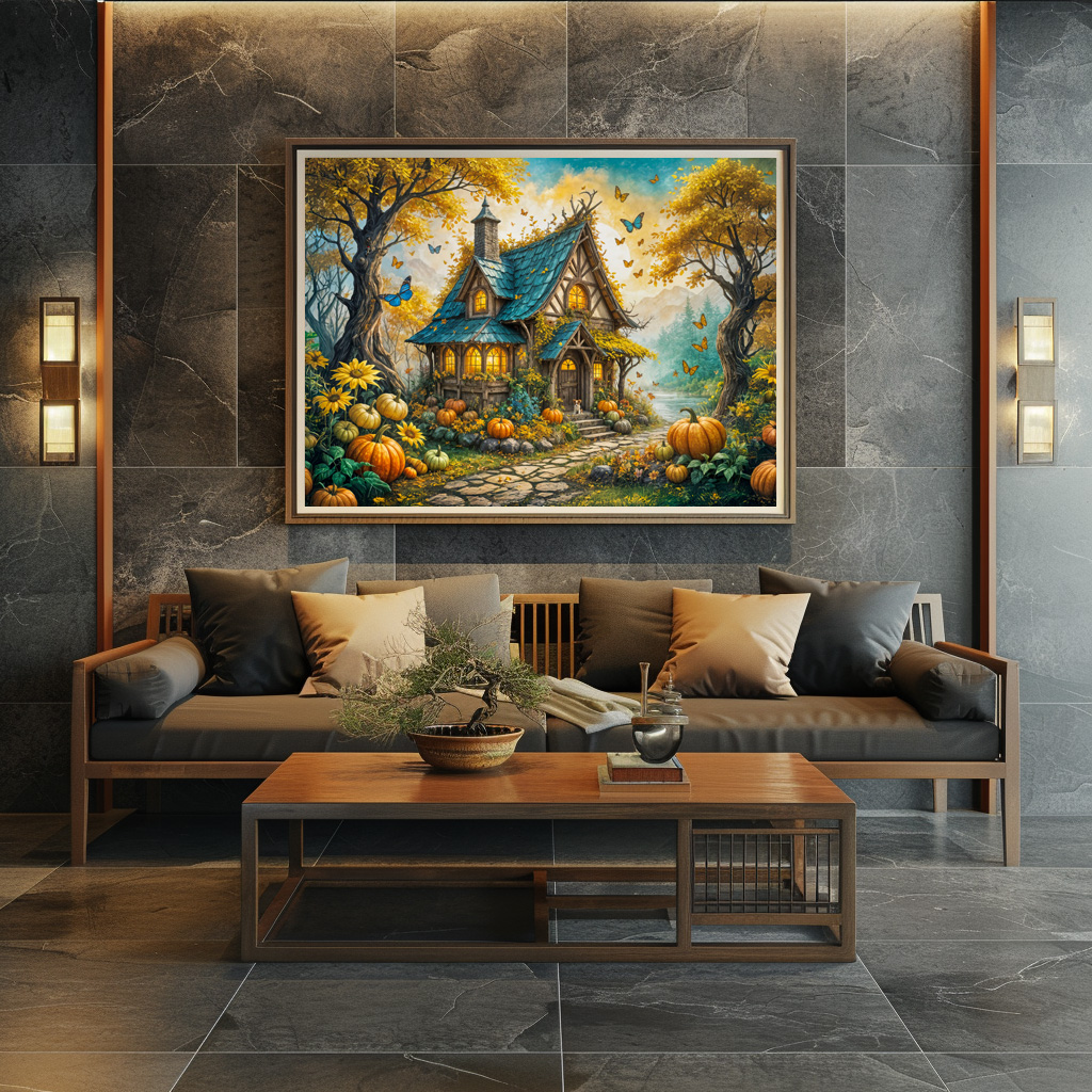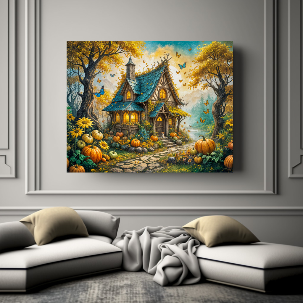 "Enchanting Autumn Cottage with Pumpkins" by Anja Frost