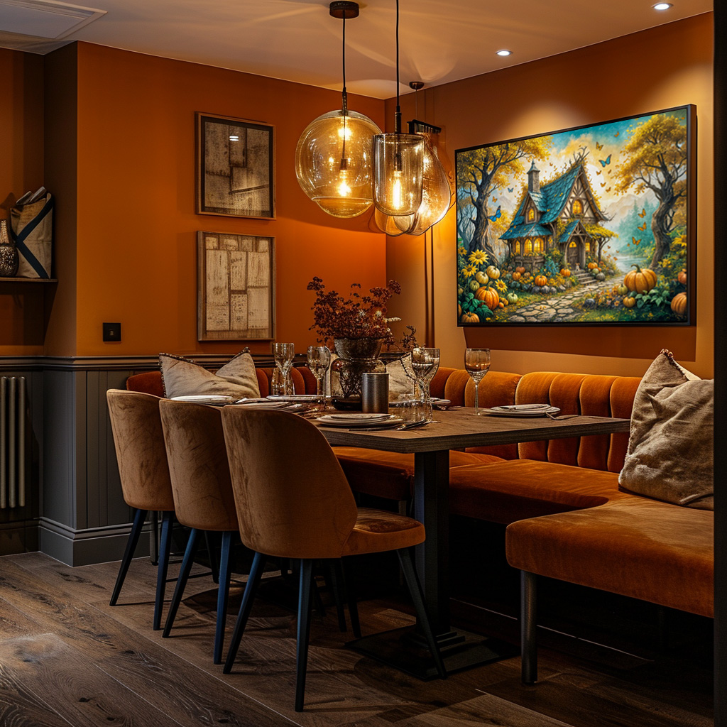 charming cottage nestled in a vibrant autumn garden, surrounded by pumpkins and colorful fall foliage, creating a cozy and magical atmosphere.