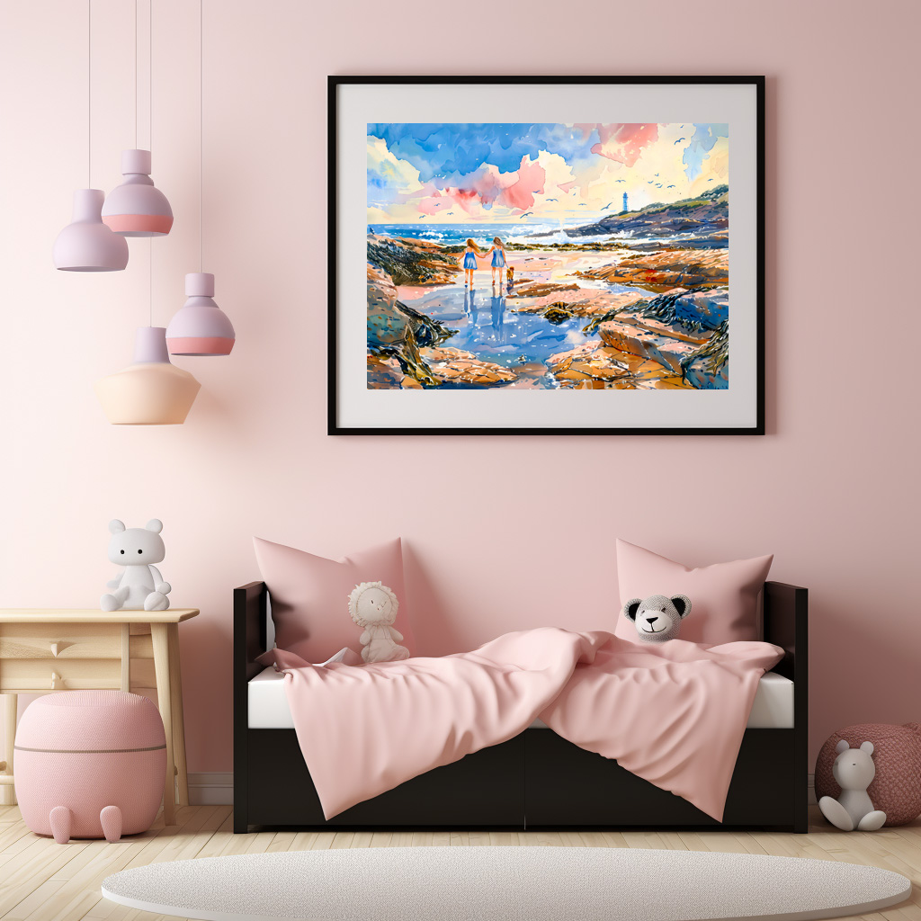 watercolor painting of two girls and their dog running along a rocky beach in summer, with a lighthouse in the background