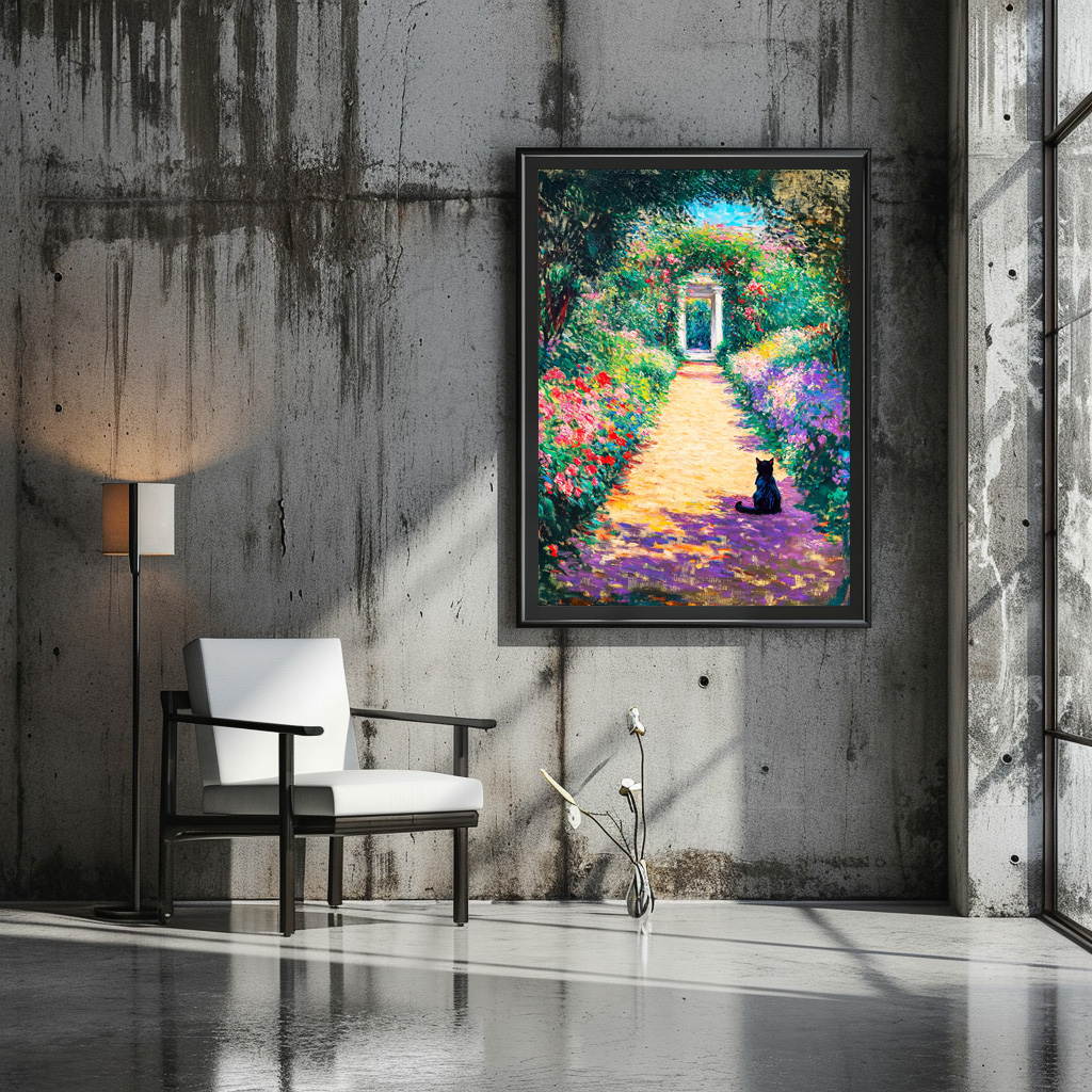 An impressionistic oil painting featuring a small cat sitting on a garden path surrounded by blooming flowers. A serene and colorful depiction of feline grace and nature’s beauty.